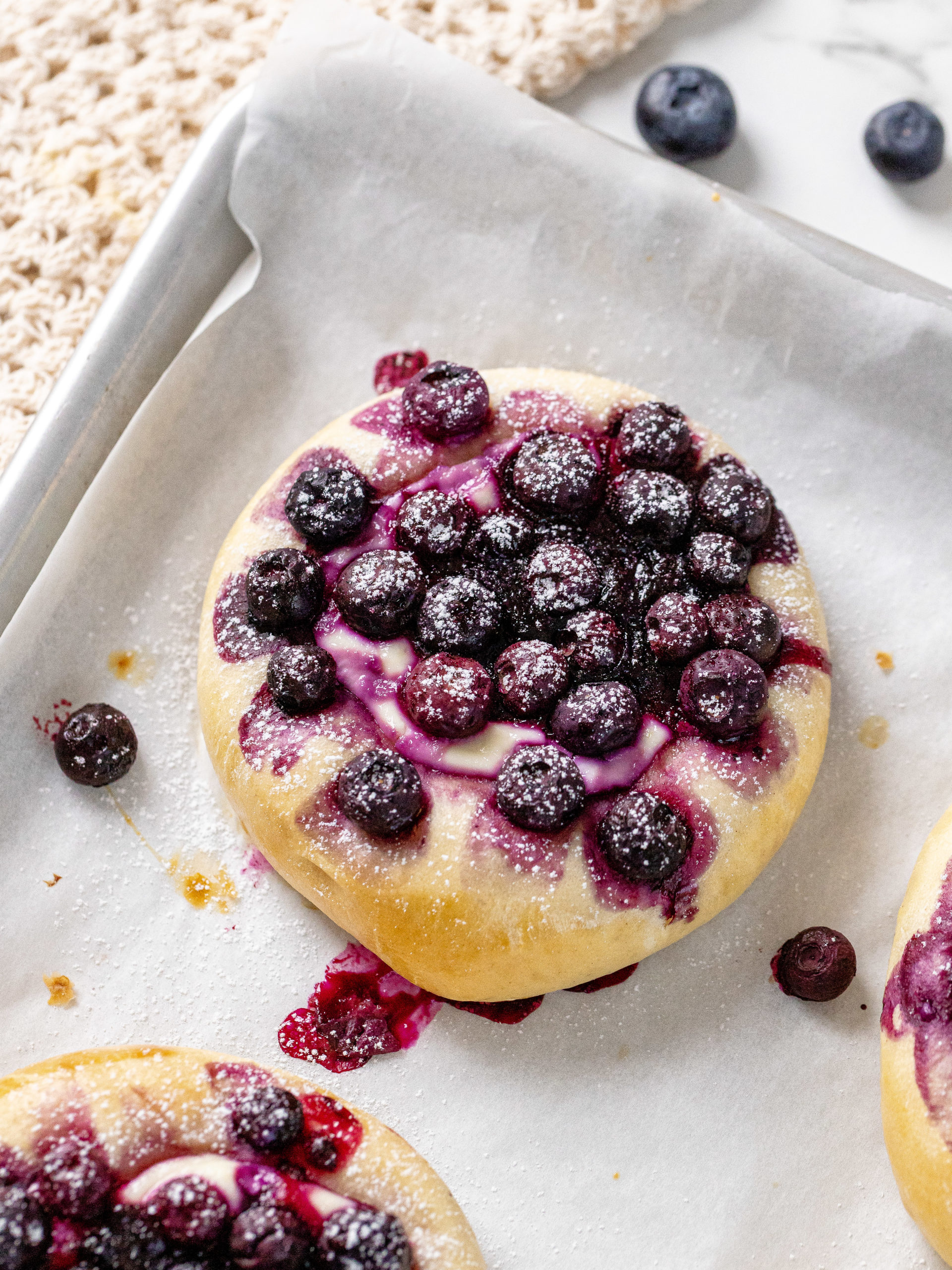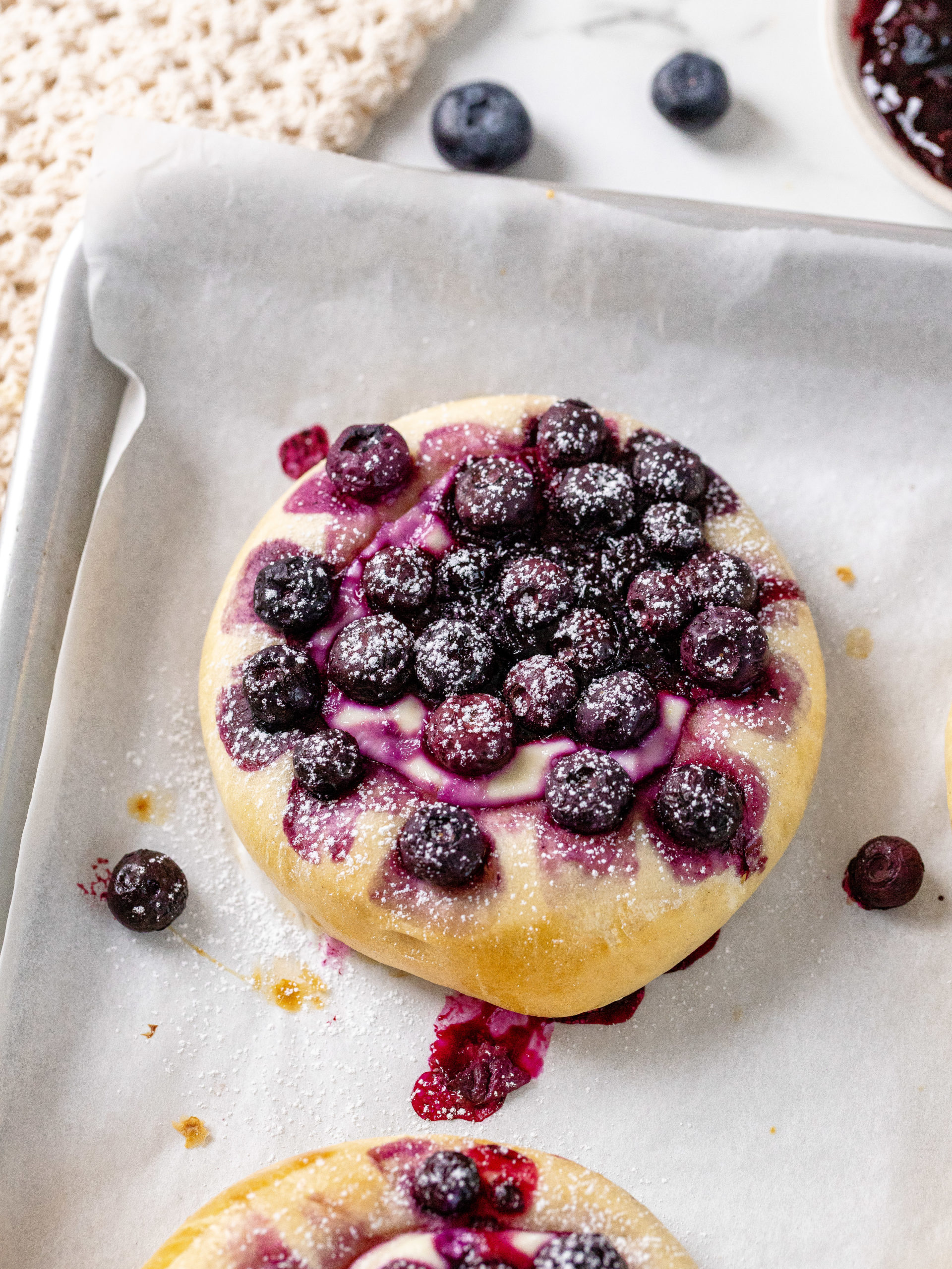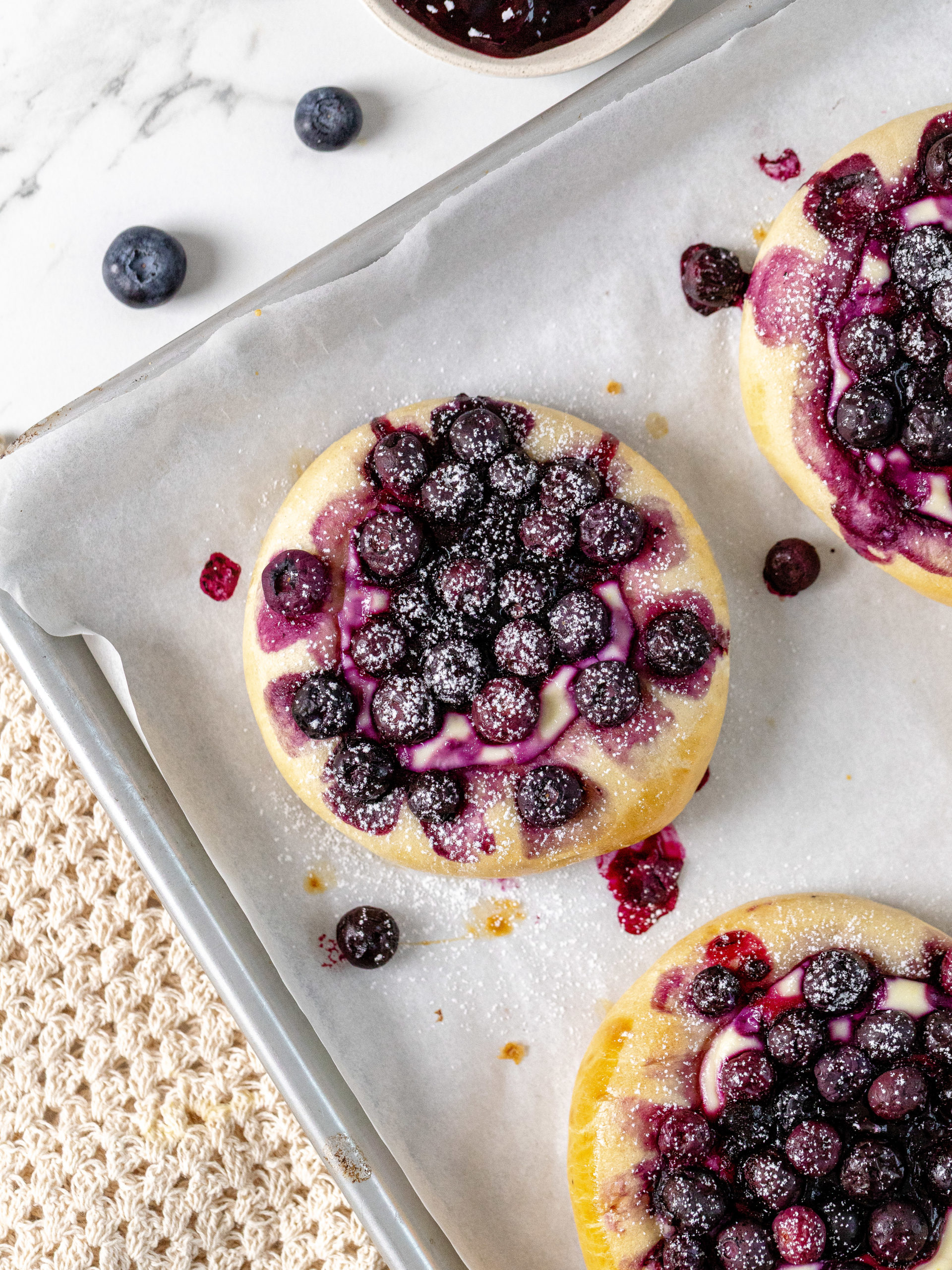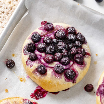 - Blueberry jam and blueberries: The buns are filled with blueberry jam that melts right into the center and they are topped with lots of delicious blueberries.
