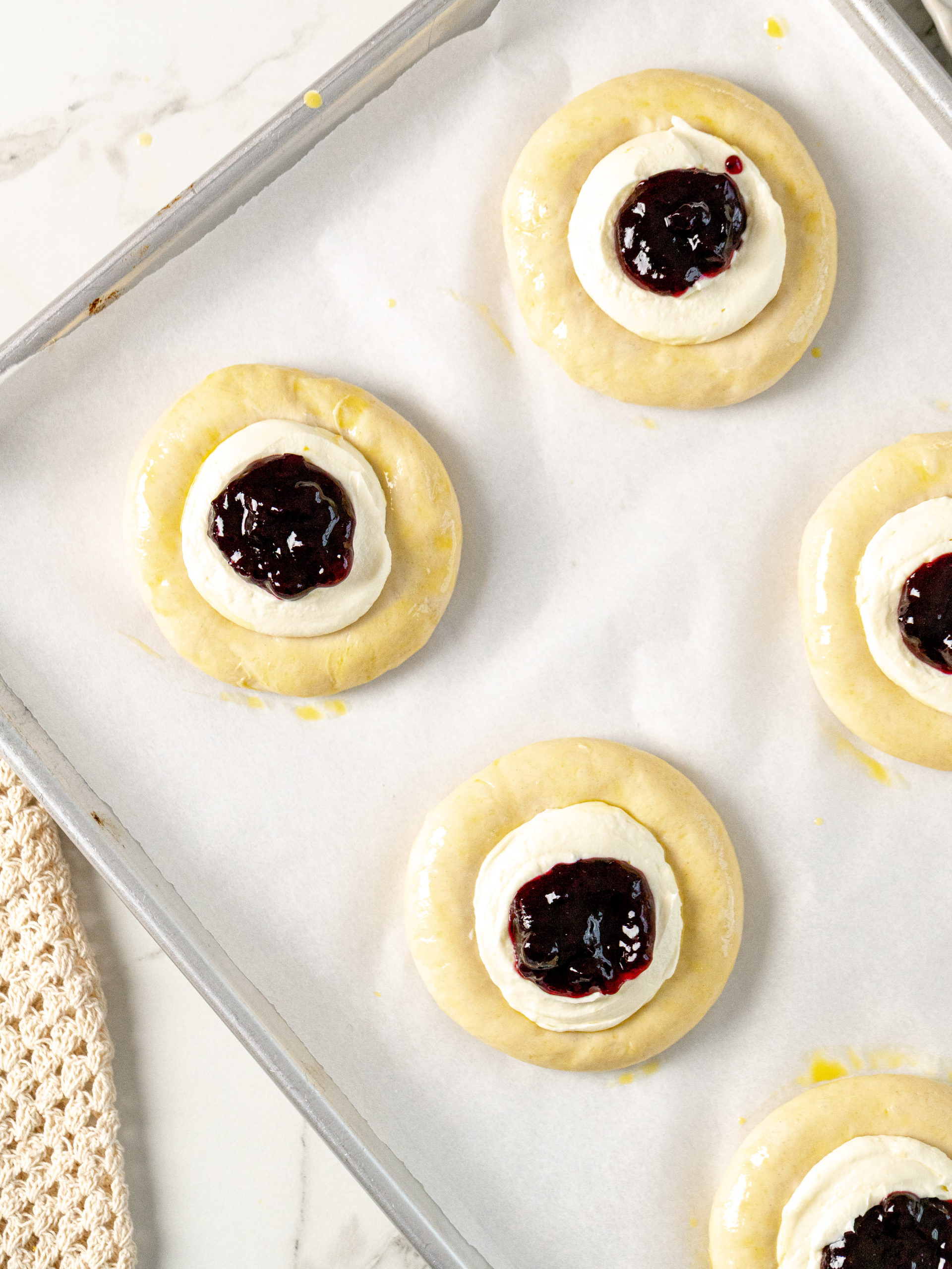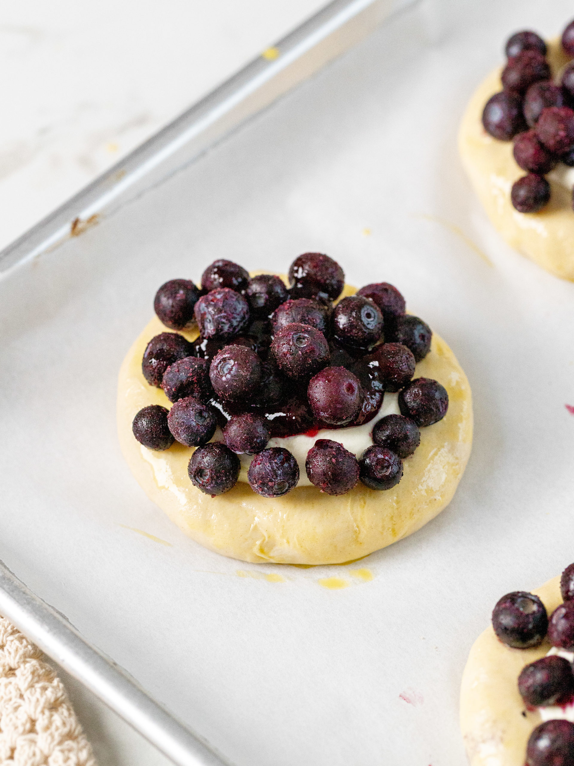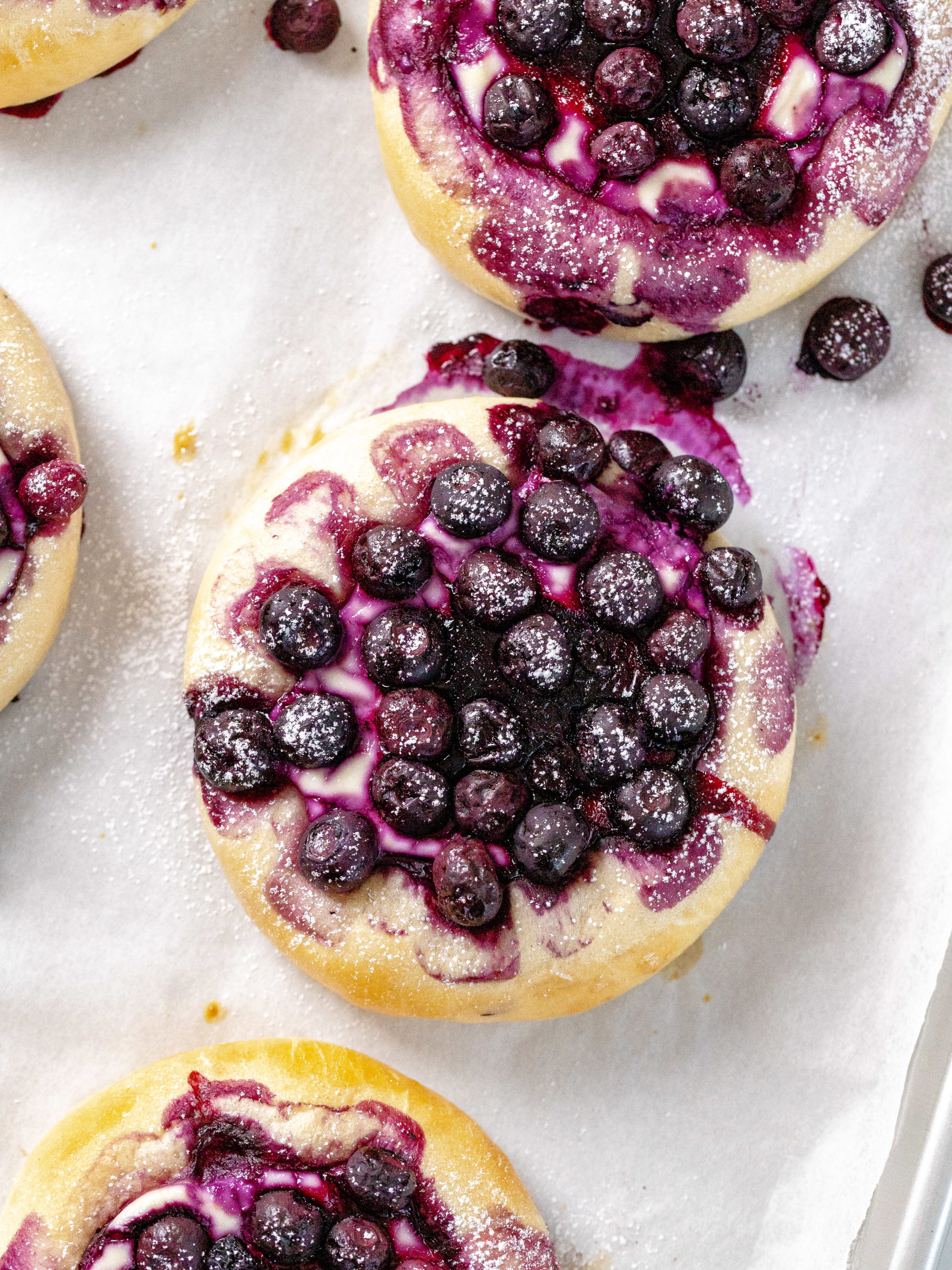 - Blueberry jam and blueberries: The buns are filled with blueberry jam that melts right into the center and they are topped with lots of delicious blueberries.