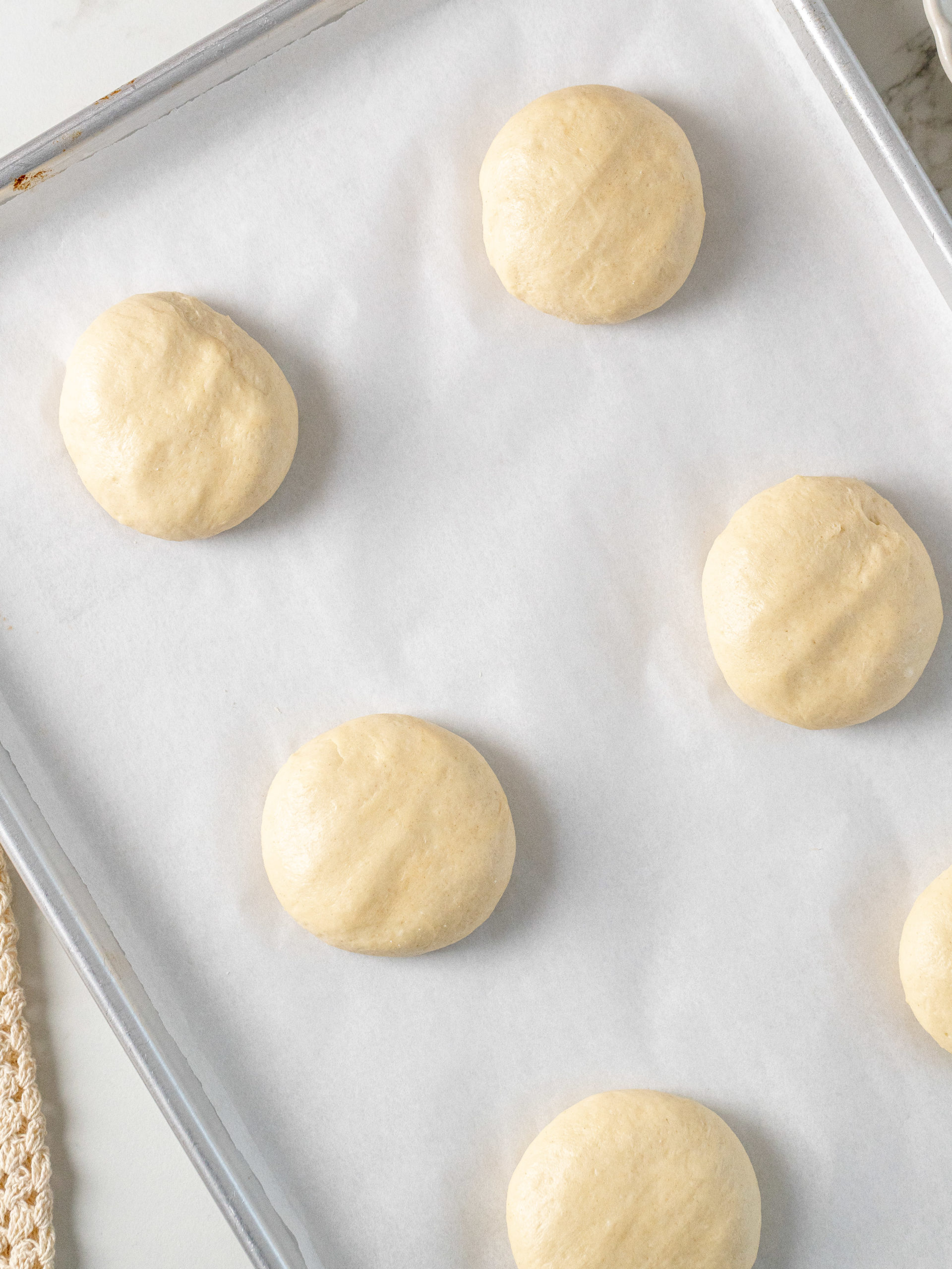 STEP 2: After the first rise, divide the dough into 12. Roll the dough into balls and place them on two baking sheet lined with parchment paper. Gently press the buns down to get more of a donut shape. Let them rise for a second time on the kitchen counter for 45 minutes.