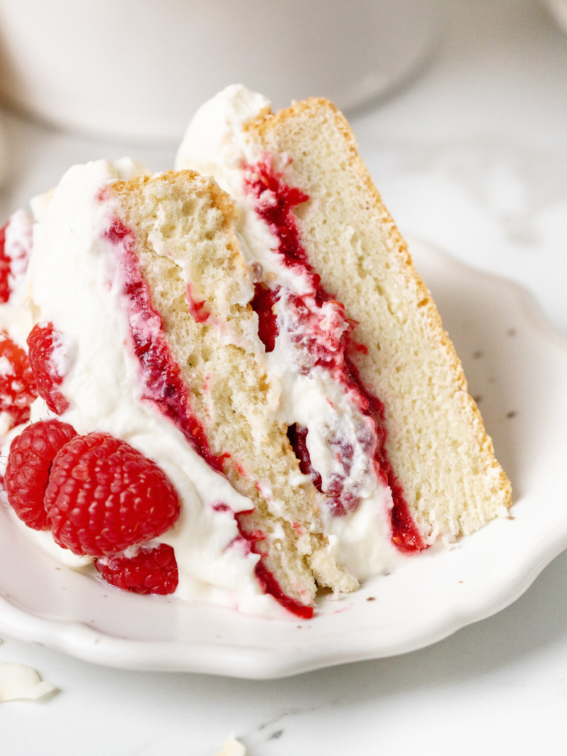 This coconut raspberry cake features soft, fluffy coconut sponge layers filled with homemade raspberry jam, and a light whipped coconut cream. It’s finished with fresh raspberries and coconut flakes. The delicate coconut flavor pairs beautifully with the bright, tangy berries, creating a cake that’s both refreshing and indulgent.