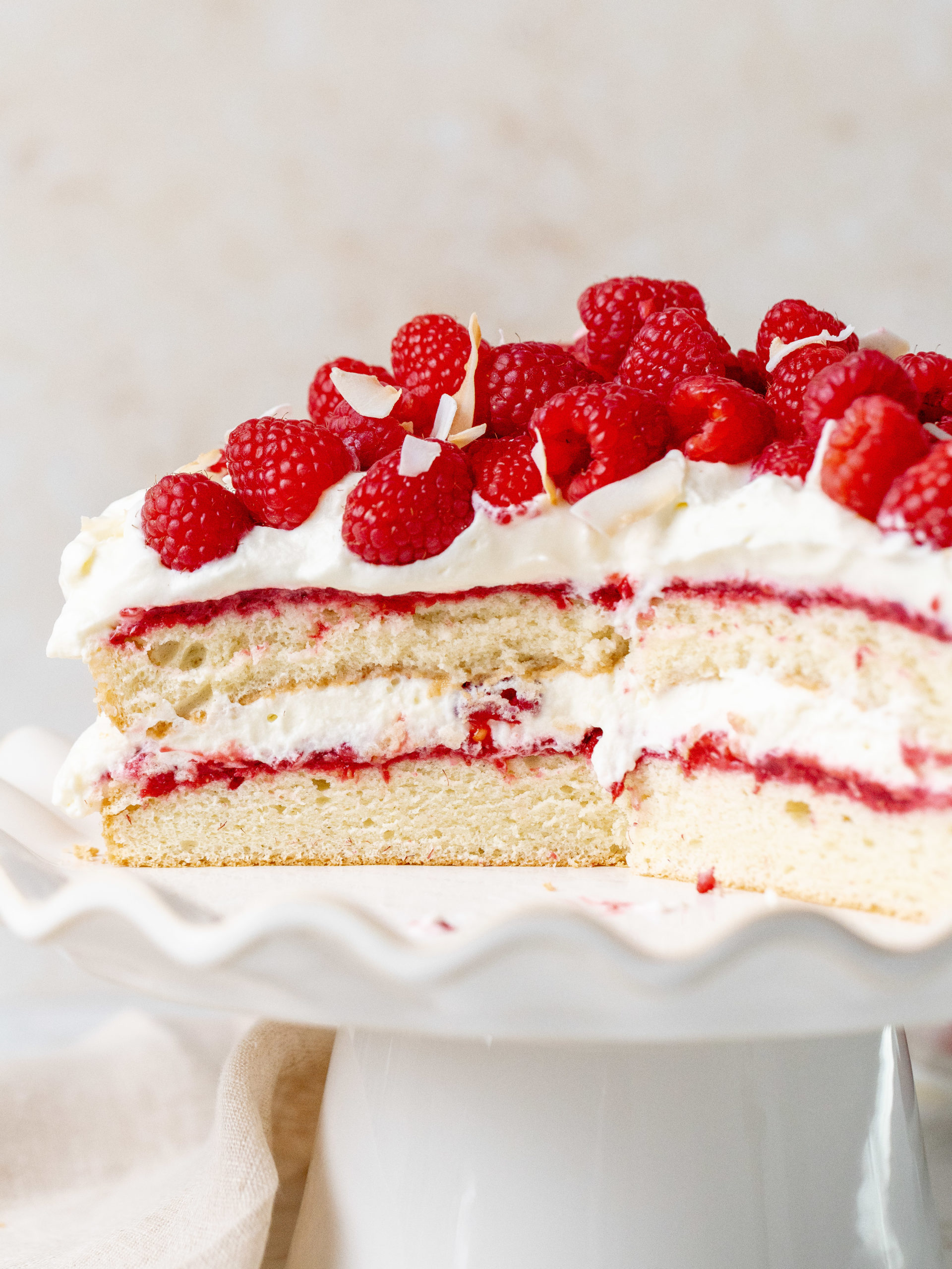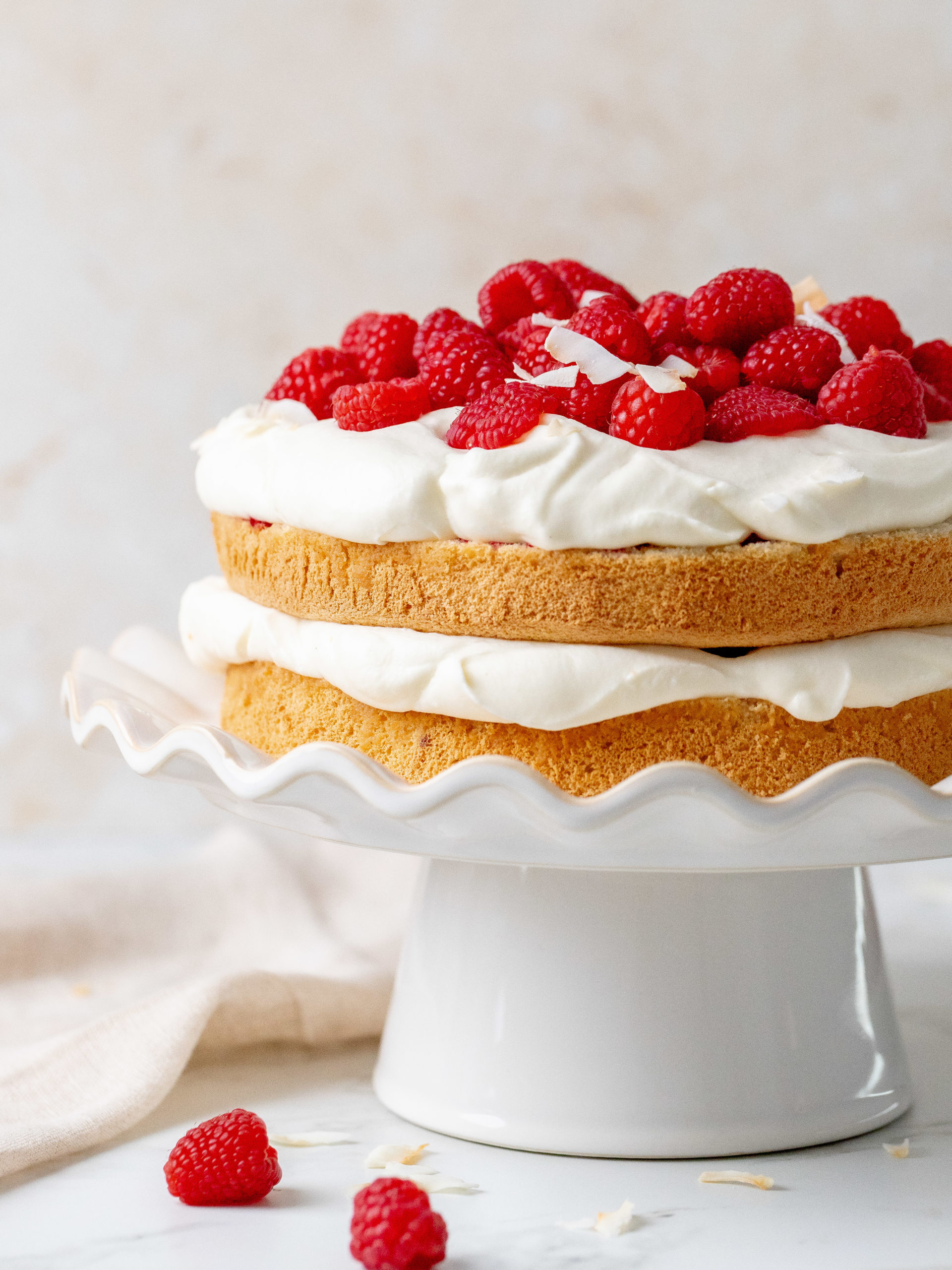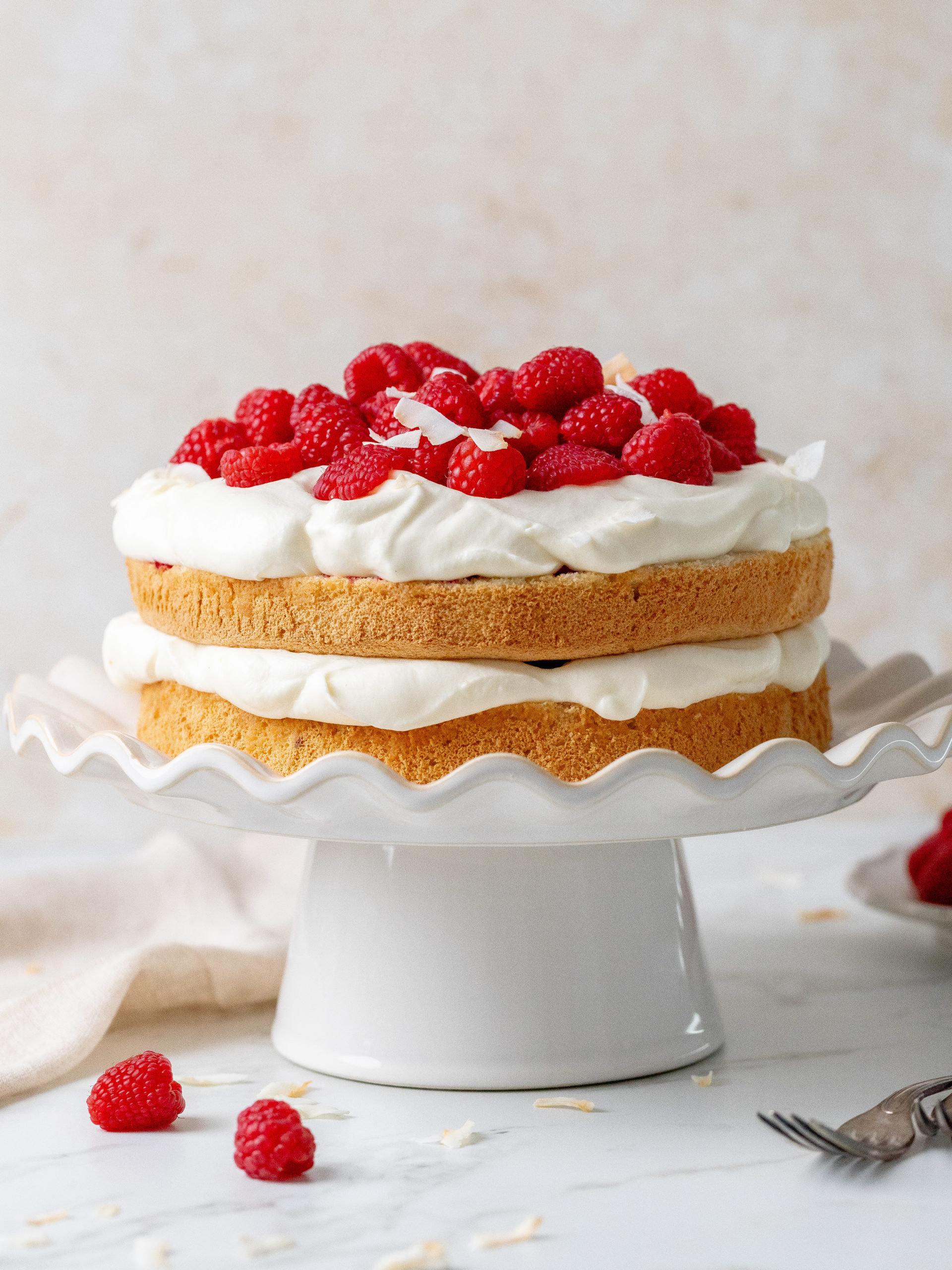 - Using a serrated knife, cut the sponge into two layers. Add the first sponge layer onto your serving plate and add half of the raspberry jam and even it out. Then add half of the whipped coconut cream and top it with a layer of fresh halved raspberries. Do the same one more time and as well add more fresh raspberries on top for decoration. Sprinkle it with coconut flakes and it’s ready to be served. Store it in the fridge.375 g fresh raspberries, Coconut flakes for decoration
