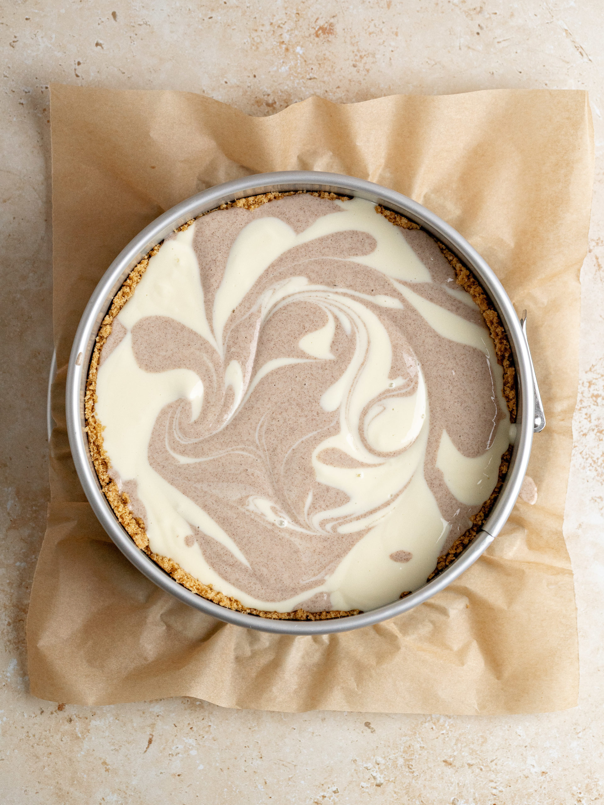 • Pour half of the cheesecake mixture into a bowl and add the ground cinnamon. Mix it together until fully combined. Then alternate by adding the cinnamon and plain cheesecake filling into the spring pan. Lastly gently swirl the two mixtures around to create a nice pattern.