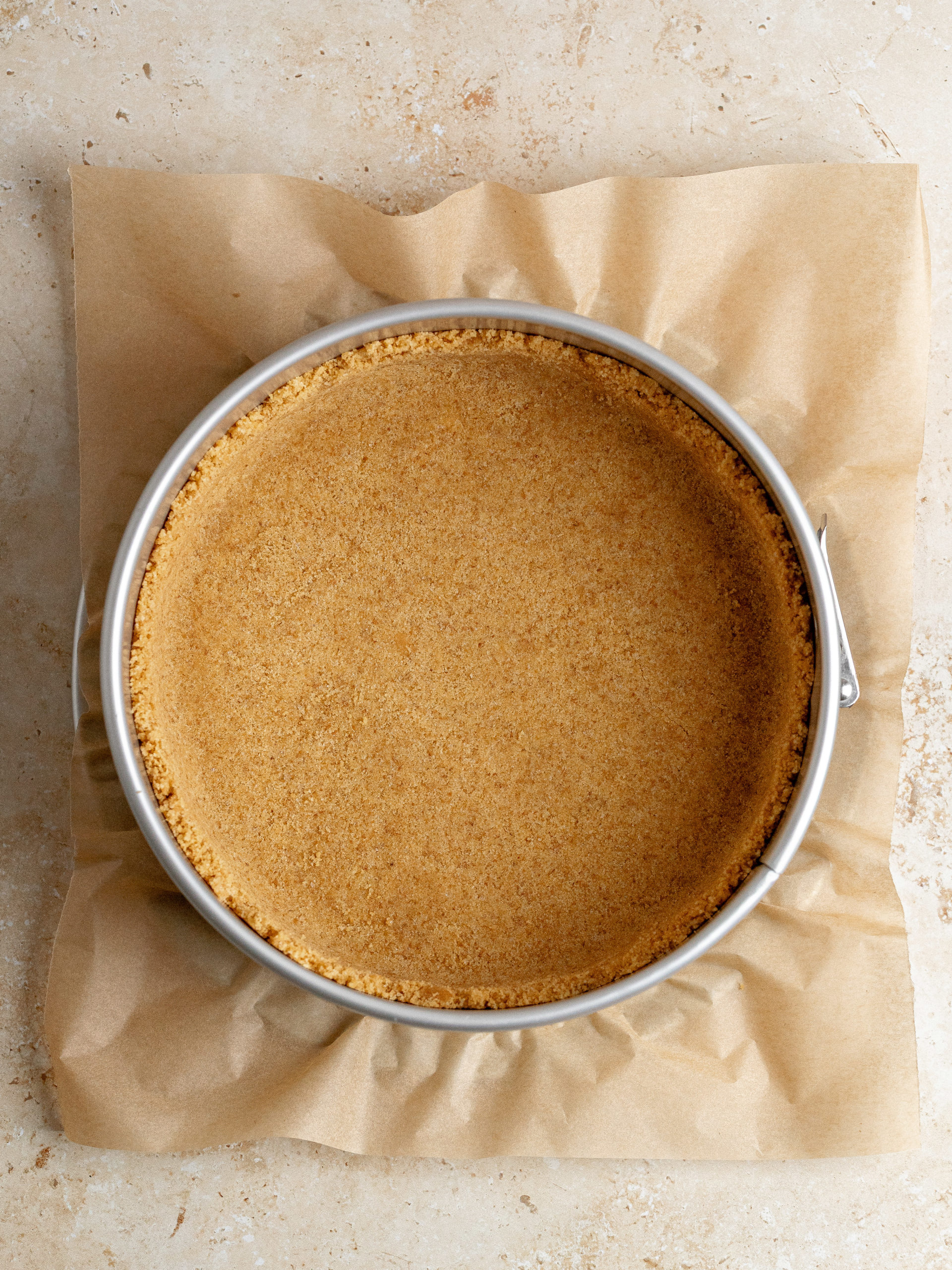 STEP 2: Add the cookie crumbs to the springform and press the cookie crust down with the bottom of a glass, and up against the side of the pan, so it’s well packed together and flattened out.