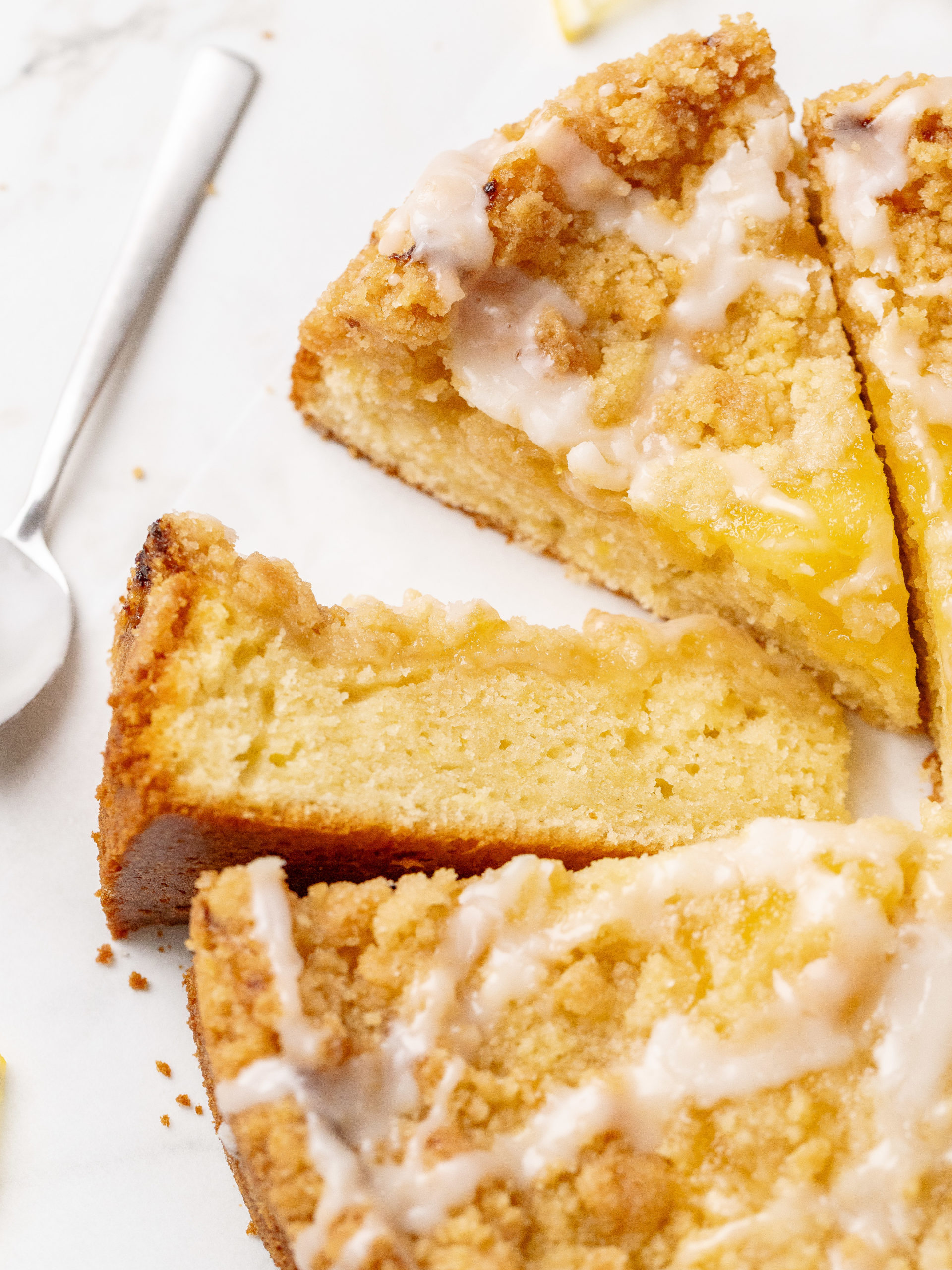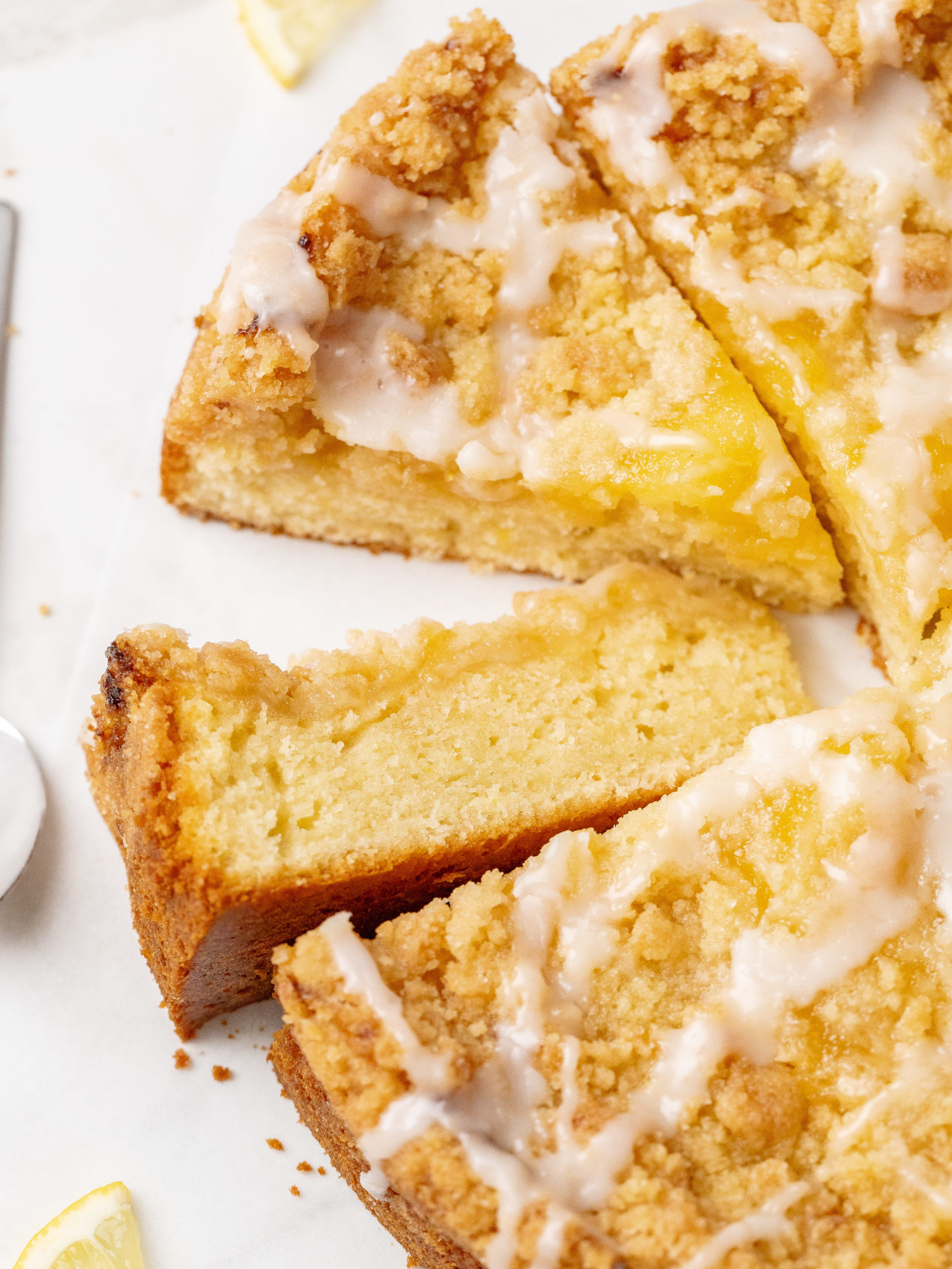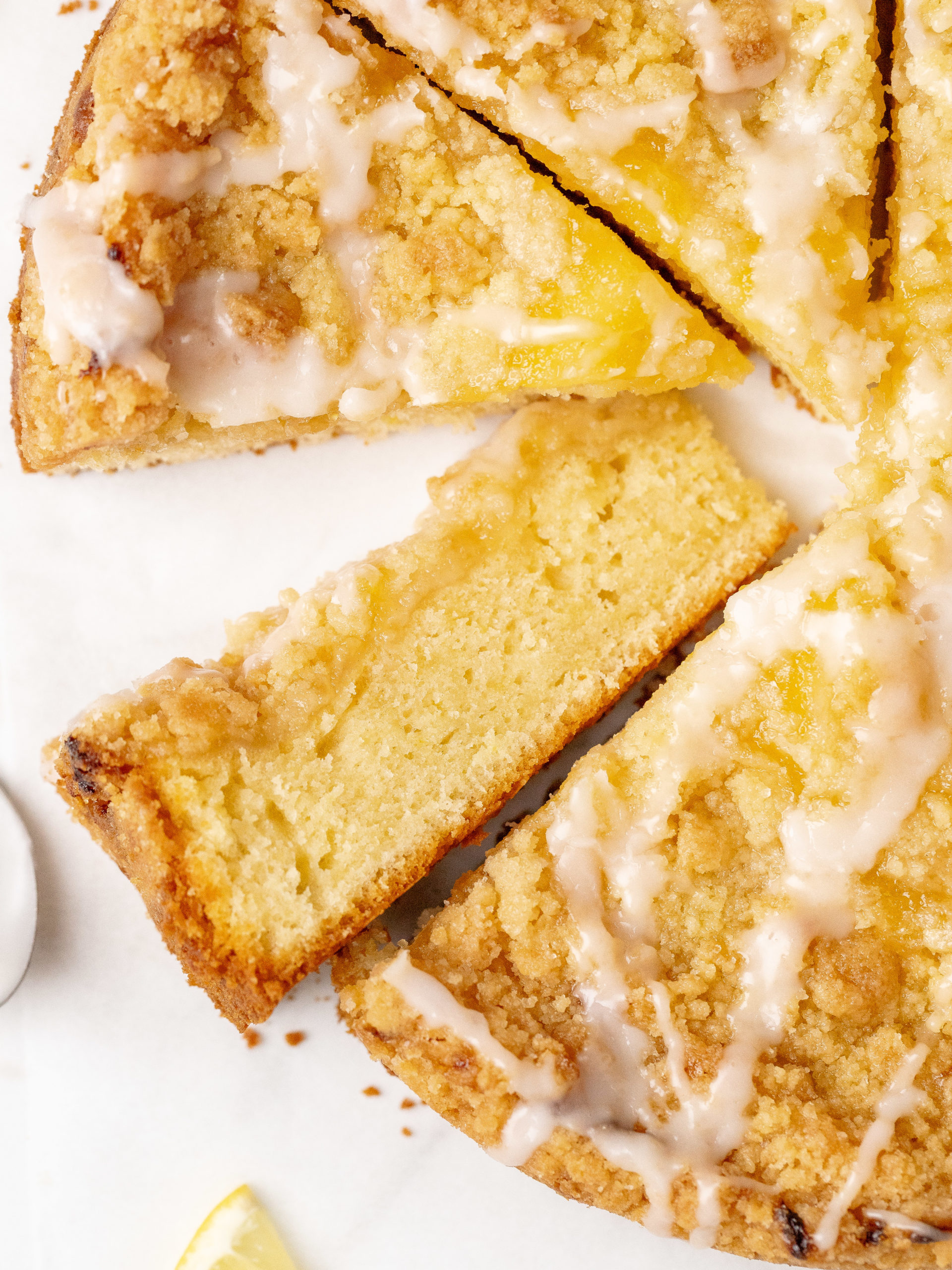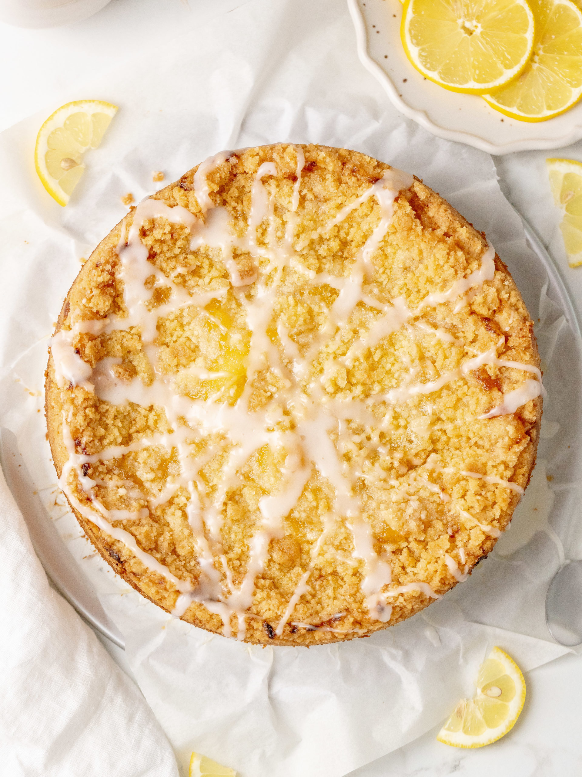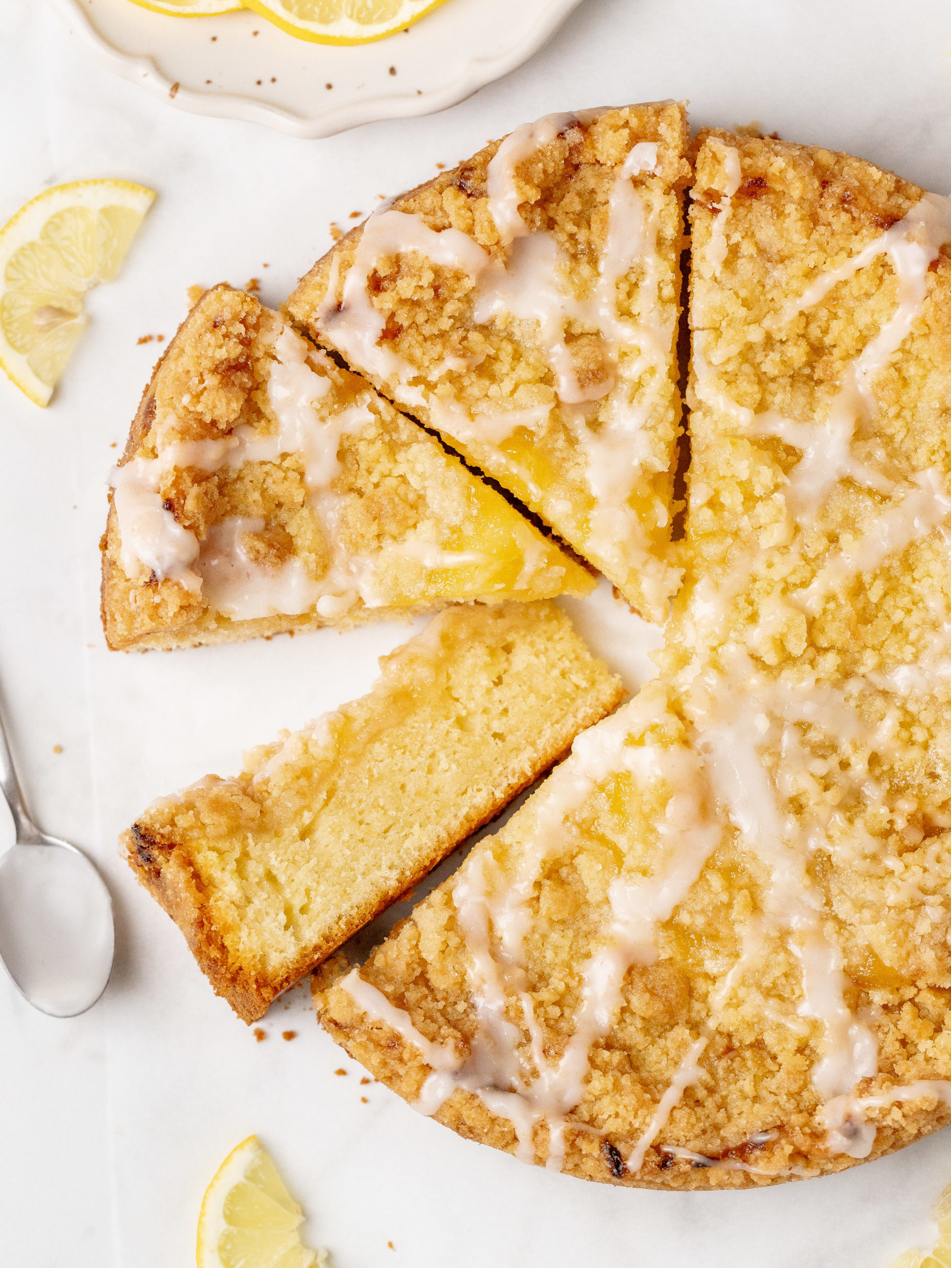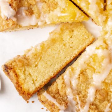 Denne kaffekage med citroncreme er blød, smøragtig og fyldt med en frisk citronsmag. Den består af en luftig citronkage, der er toppet med citroncreme, en sprød crumble og en frisk citronglasur. Den har den perfekte balance mellem sødme og citrus. Med sin saftige konsistens og gyldne streusel er denne kage ideel til morgenmad, brunch eller dessert.