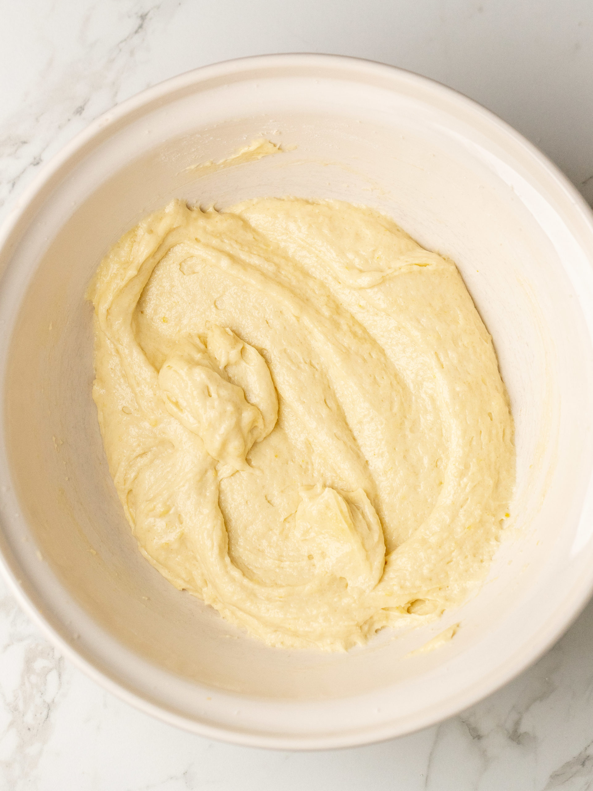 - Tilsæt derefter citronsaft, creme fraiche, vegetabilsk olie og vaniljeekstrakt, og bland, indtil det hele er blandet sammen. Tilsæt derefter den anden halvdel af de tørre ingredienser, og bland, indtil det hele er blandet.1 spiseskefuld citronsaft, 150 g creme fraiche 14-18%, 25 g vegetabilsk olie, 1 teskefuld vaniljeekstrakt