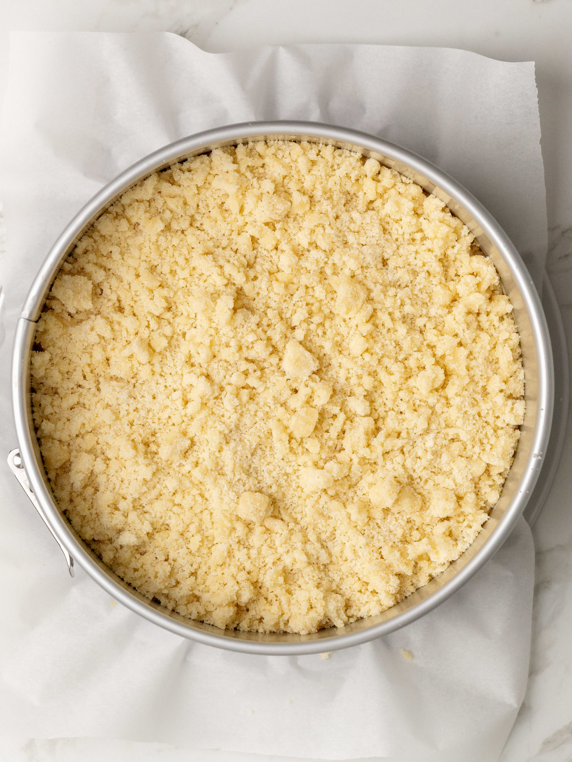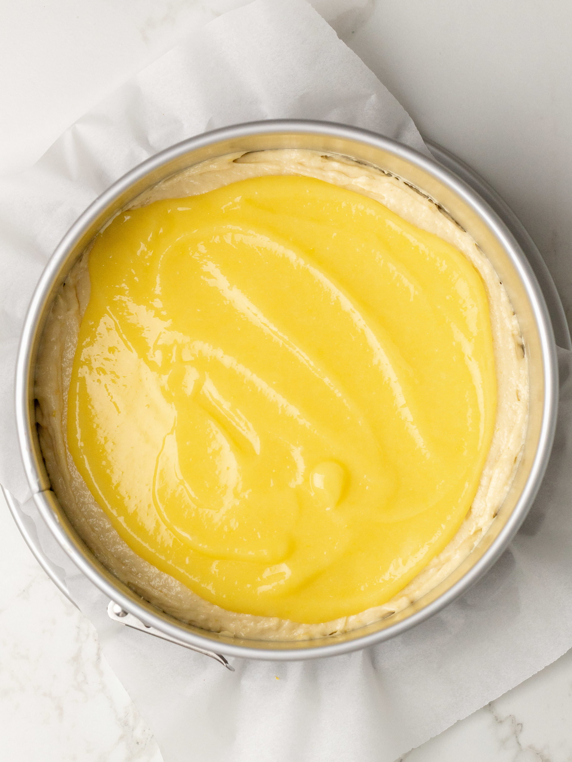 - Hæld kagedejen i den forberedte kageform, og glat den ud. Fordel derefter citroncremen ovenpå, og smør den ud i et jævnt lag. Afslut med at drysse crumble ovenpå.
