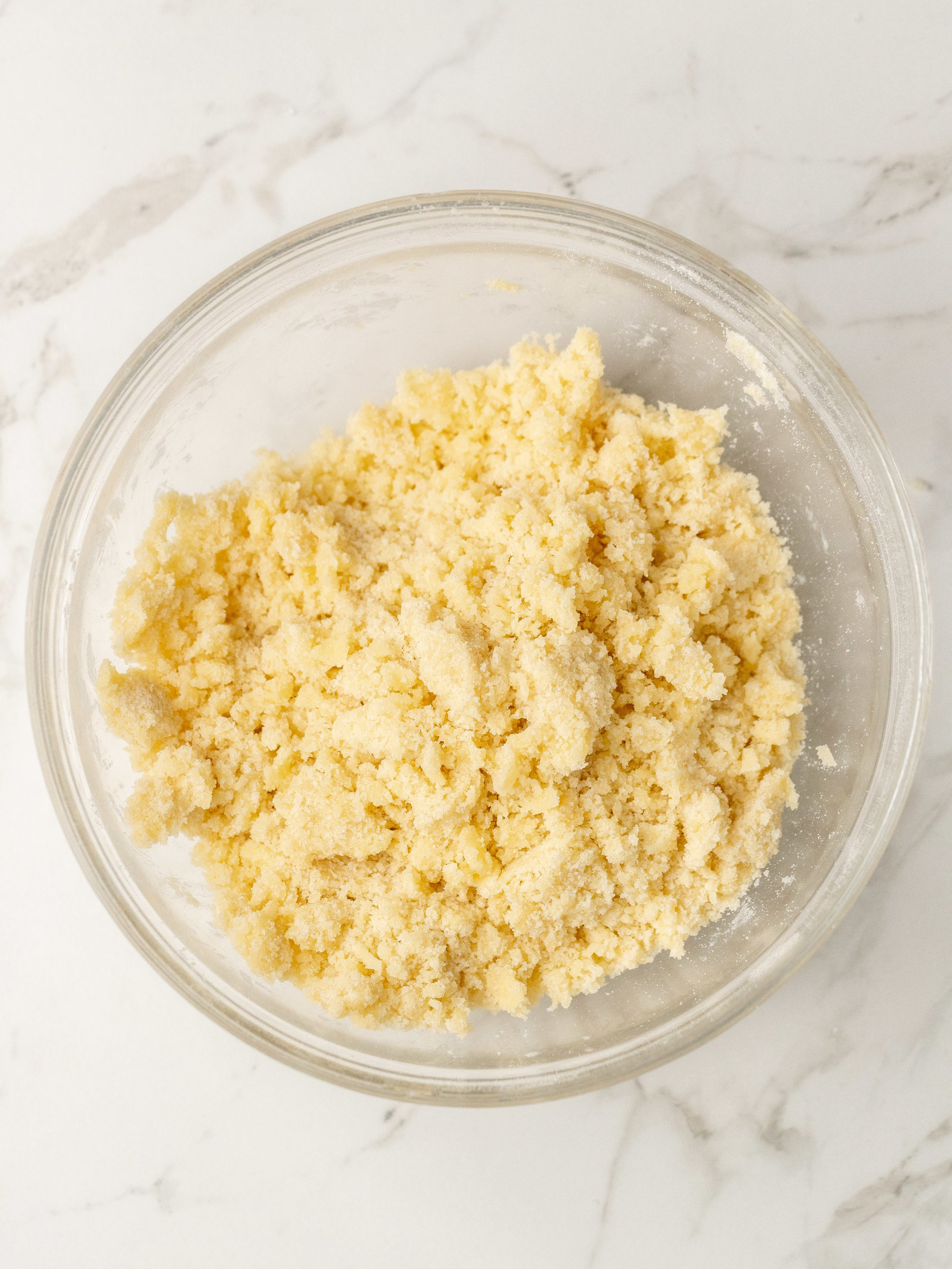 - Kom alle ingredienserne til crumblen i en skål, og bland det sammen, enten i hånden med en gaffel eller med en elpisker, til det får en smuldrende struktur, og der ikke er noget tørt mel tilbage. Sæt det til side, mens du forbereder kagen.120 g mel til alle formål, 200 g granuleret sukker, 100 g smør
