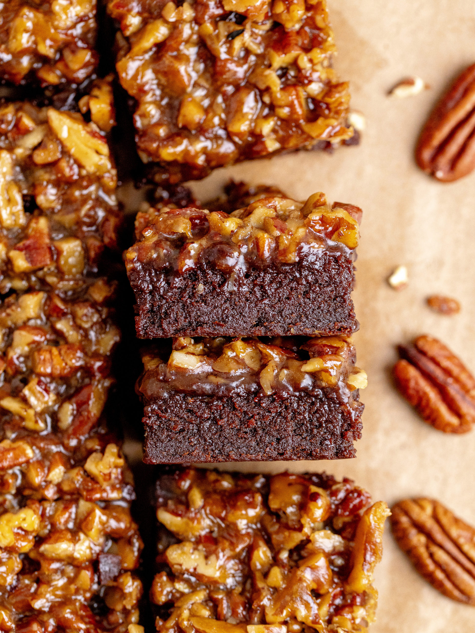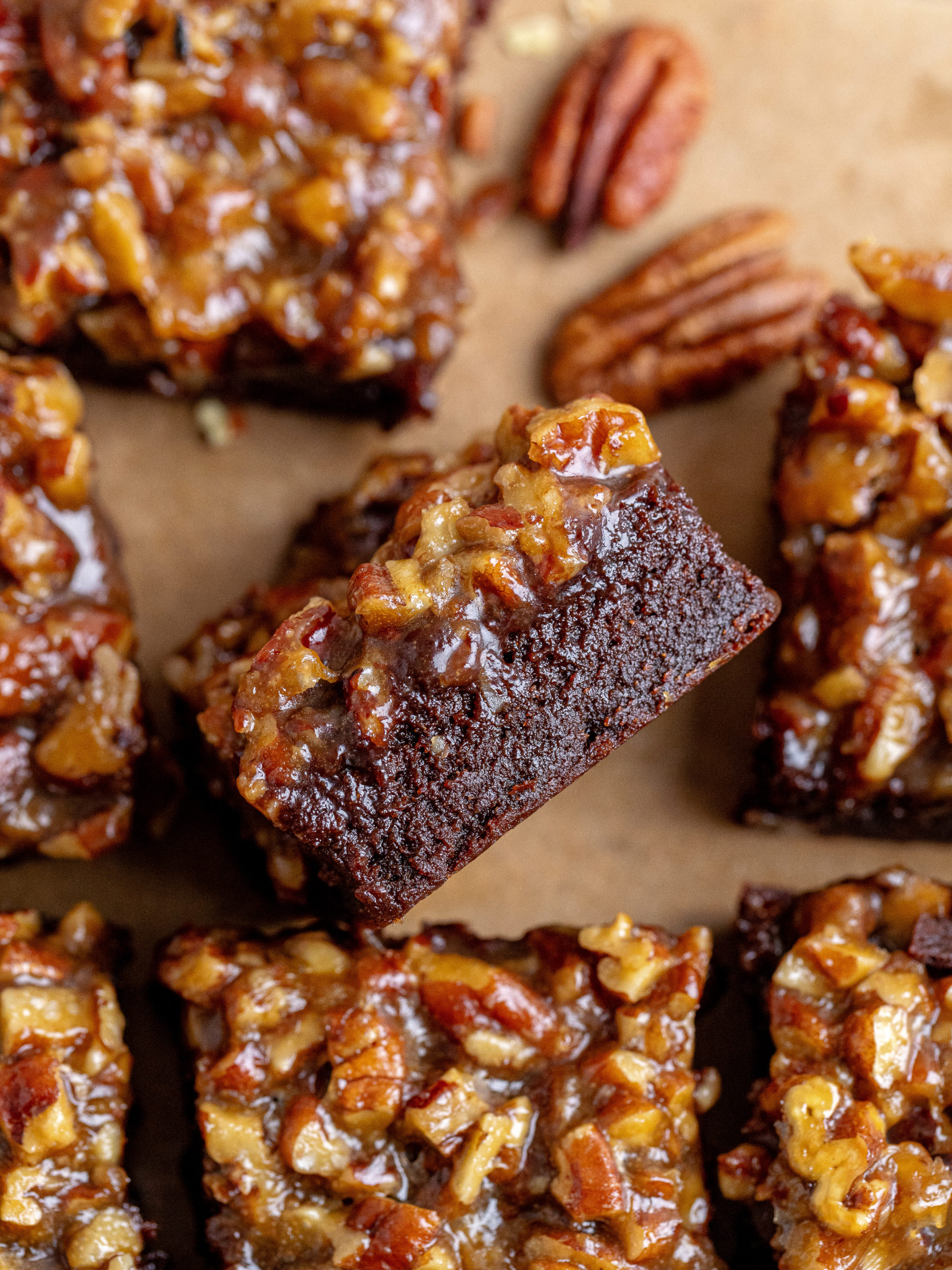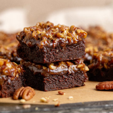 These are the BEST gooey Pecan Pie Brownies. They start with a brown butter brownie that is rich and deeply chocolatey, with the perfect fudgy texture. The brown butter gives them this warm, nutty depth, and the pecan pie topping takes it to a whole other level. It is glossy, buttery, sticky and full of chopped pecans. These brownies are gooey, comforting, and perfect to serve as a Thanksgiving dessert or during the holidays.