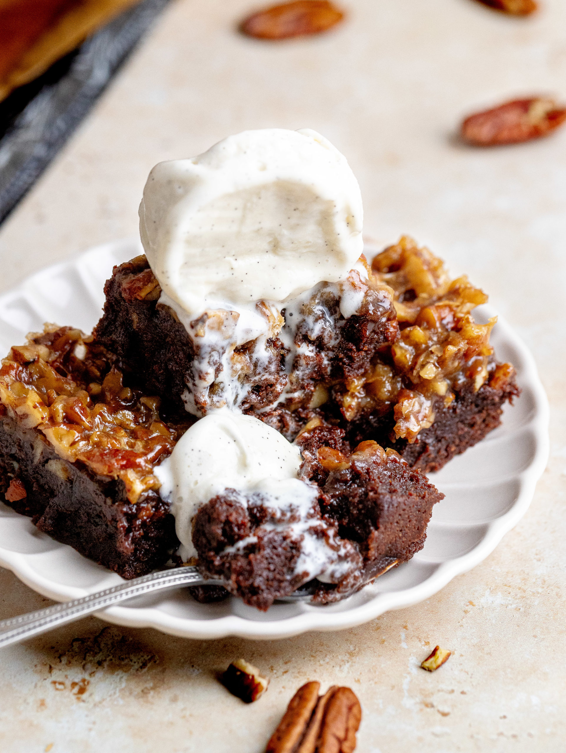 These gooey pecan pie brownies are the ultimate dessert mashup. These chewy brownies with a gooey pecan layer is what fall dreams are made of and is an easy holiday dessert to serve. They are perfect as they are but can also be served with a scoop of vanilla ice cream.