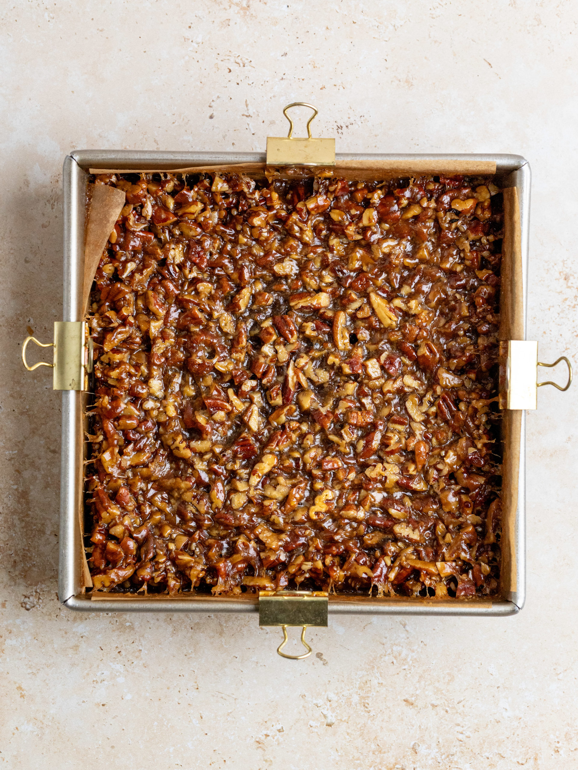 • Once the brownie has baked for 30 minutes, gently pour the pecan pie filling over the brownie and even it out. Place it back in the oven and continue baking it for 20 minutes.