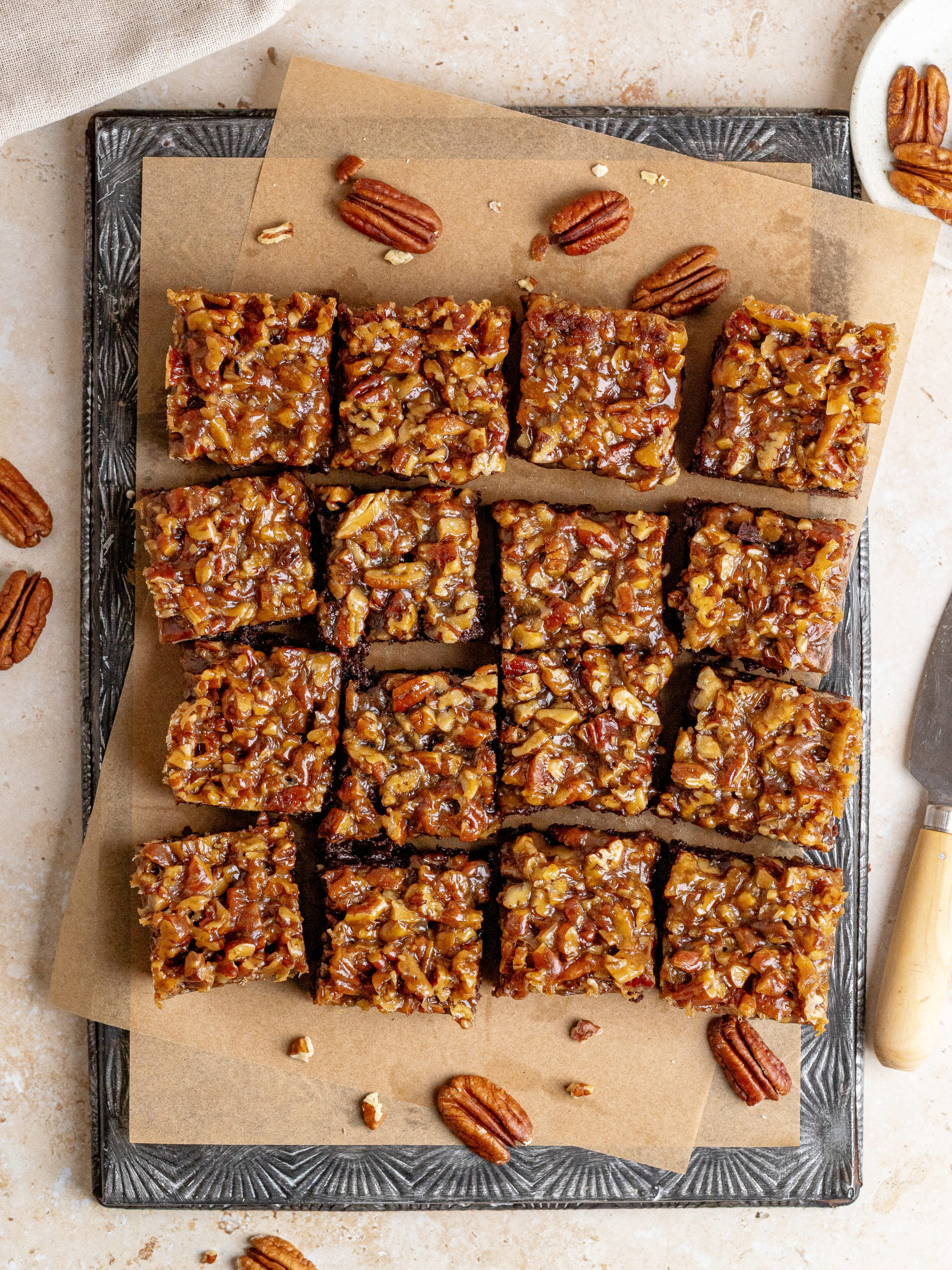 Store the pecan pie brownies in the refrigerator in an airtight container or covered with plastic wrap or aluminum foil. Take them out 30-60 minutes before serving, so they become room temperature, so the pecan pie topping is soft and gooey. Best enjoyed within 2-3 days.