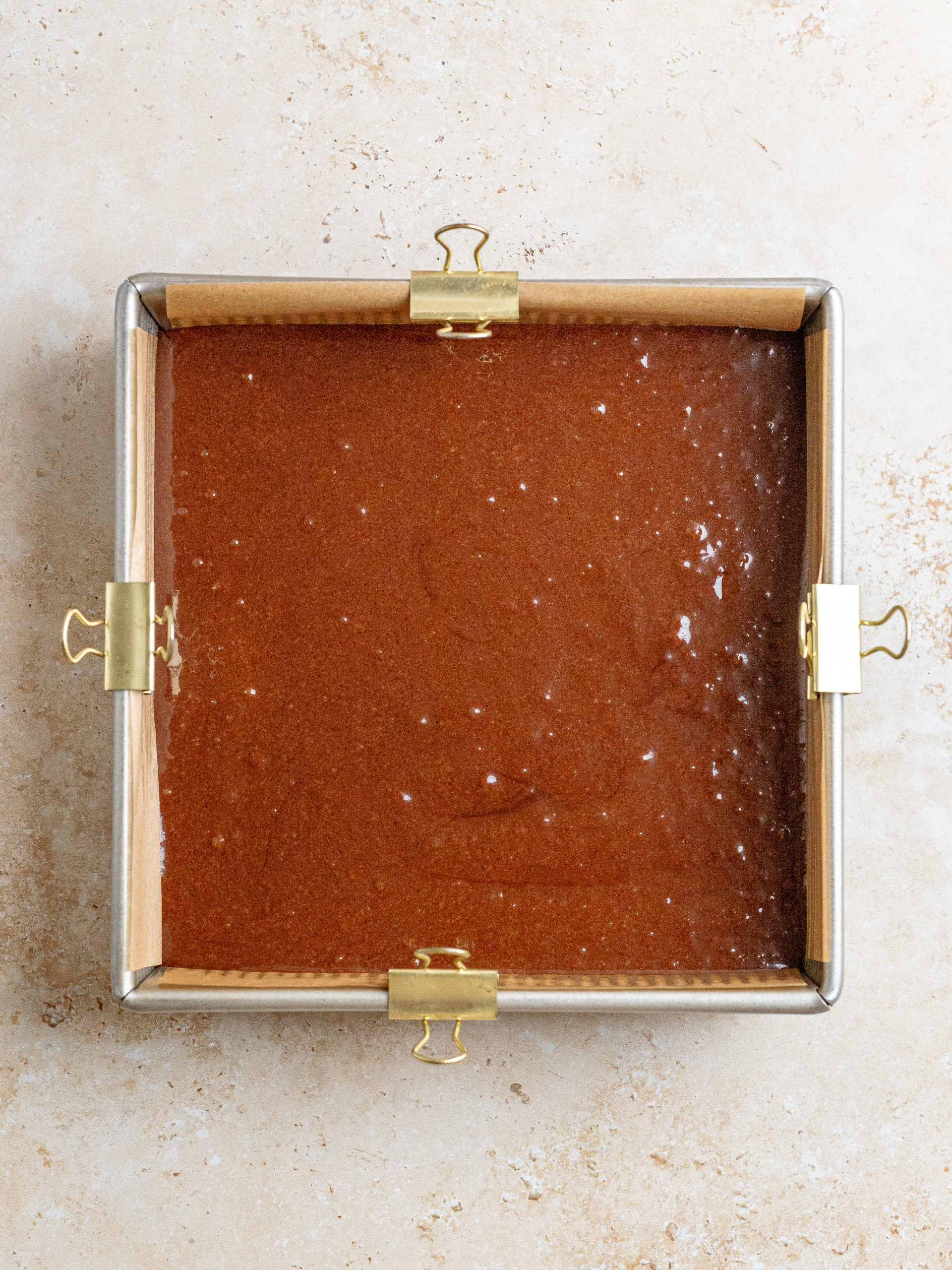 • Pour the brownie batter into the prepared baking pan and smooth it out.