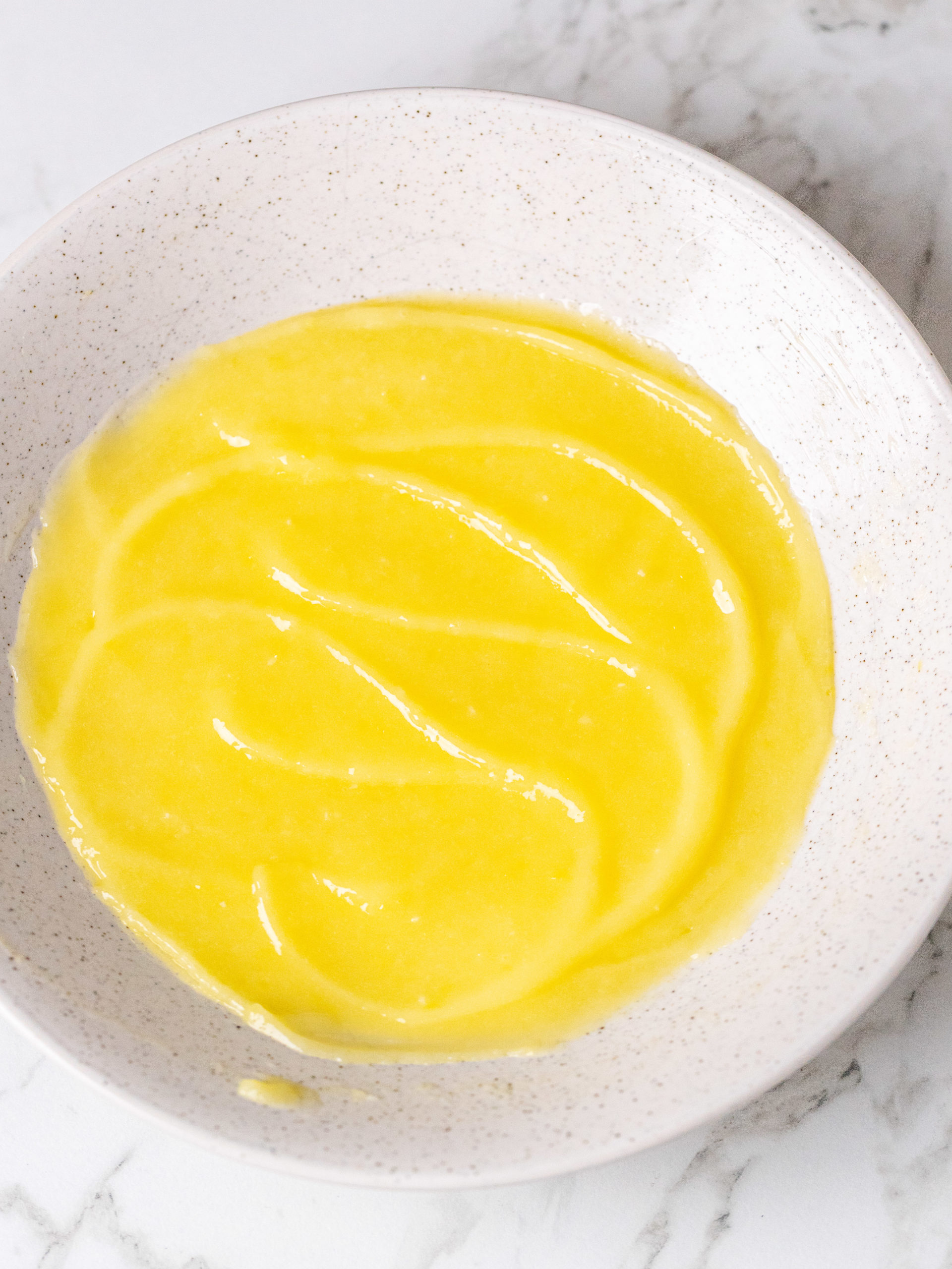 STEP 3: Let it sit for 2 minutes to slightly cool down. Then add the cold cubed butter and stir it together until smooth. Pour the curd into a shallow bowl, so it cools down faster, and cover the curd with a piece of cling film so it touches the surface or the curd and place it in the fridge. Let it cool down until cold, about 1 hours.