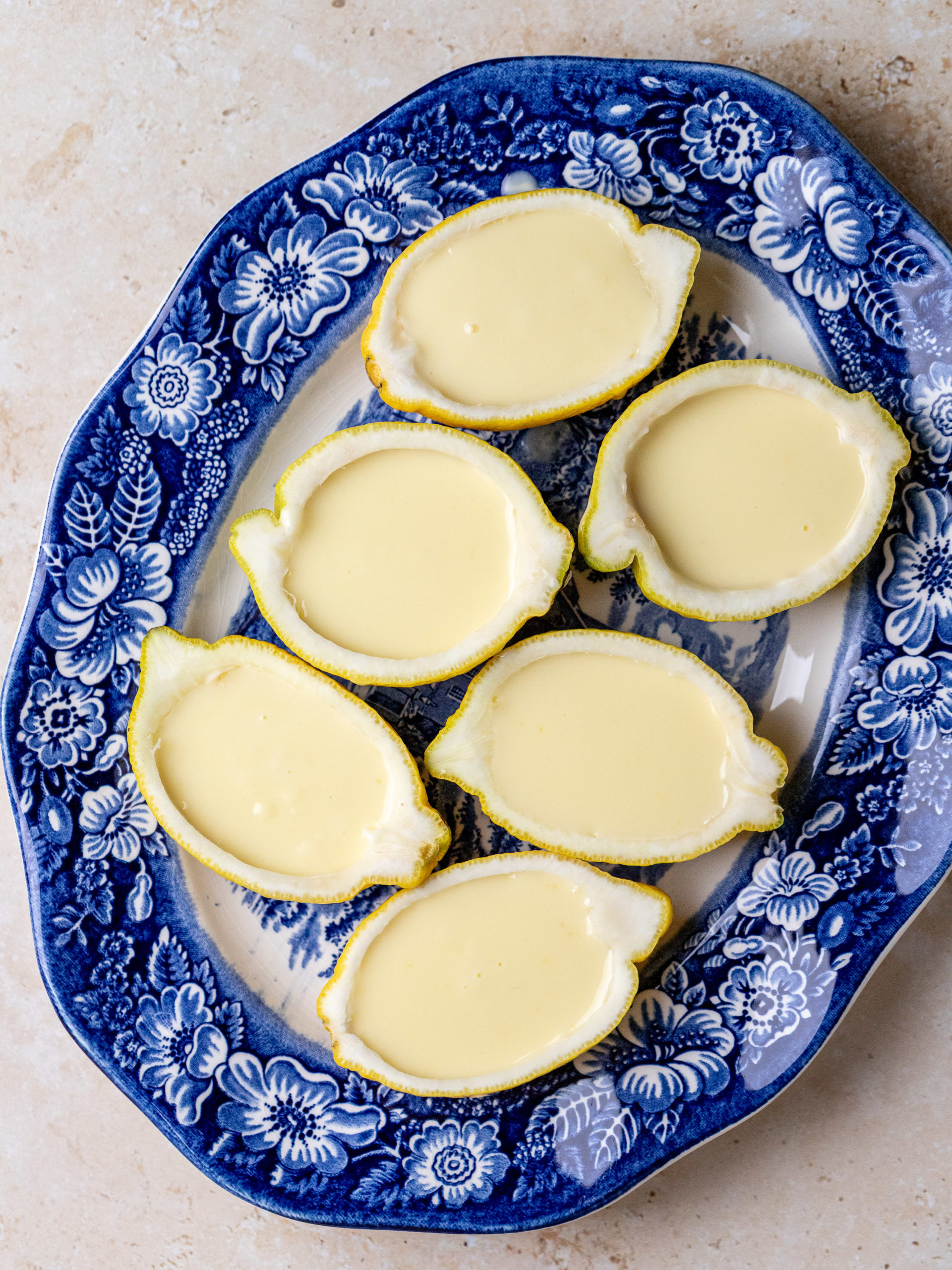 - Pour the mixture into a measuring jug and then pour the mixture into the halved lemon shells.
