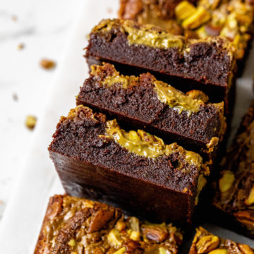 These pistachio brownies are rich, fudgy chocolate brownies swirled with creamy pistachio spread and topped with chopped pistachios for added crunch. The deep chocolate flavor pairs perfectly with the nutty sweetness of pistachio, making a perfect dessert for any fans of brownie and pistachios. These brownies are perfect to serve for any gathering, like birthdays or as a afternoon treat.