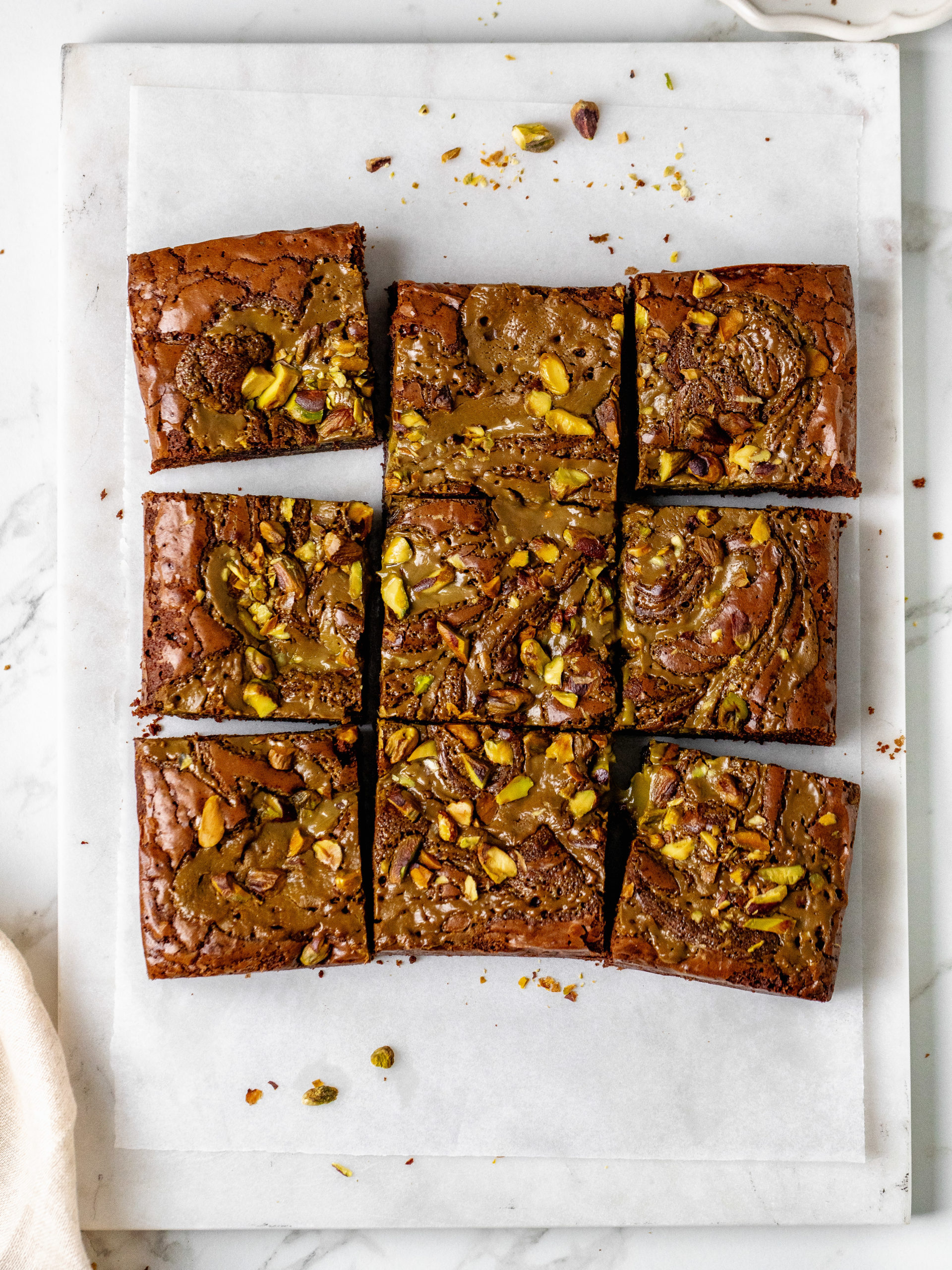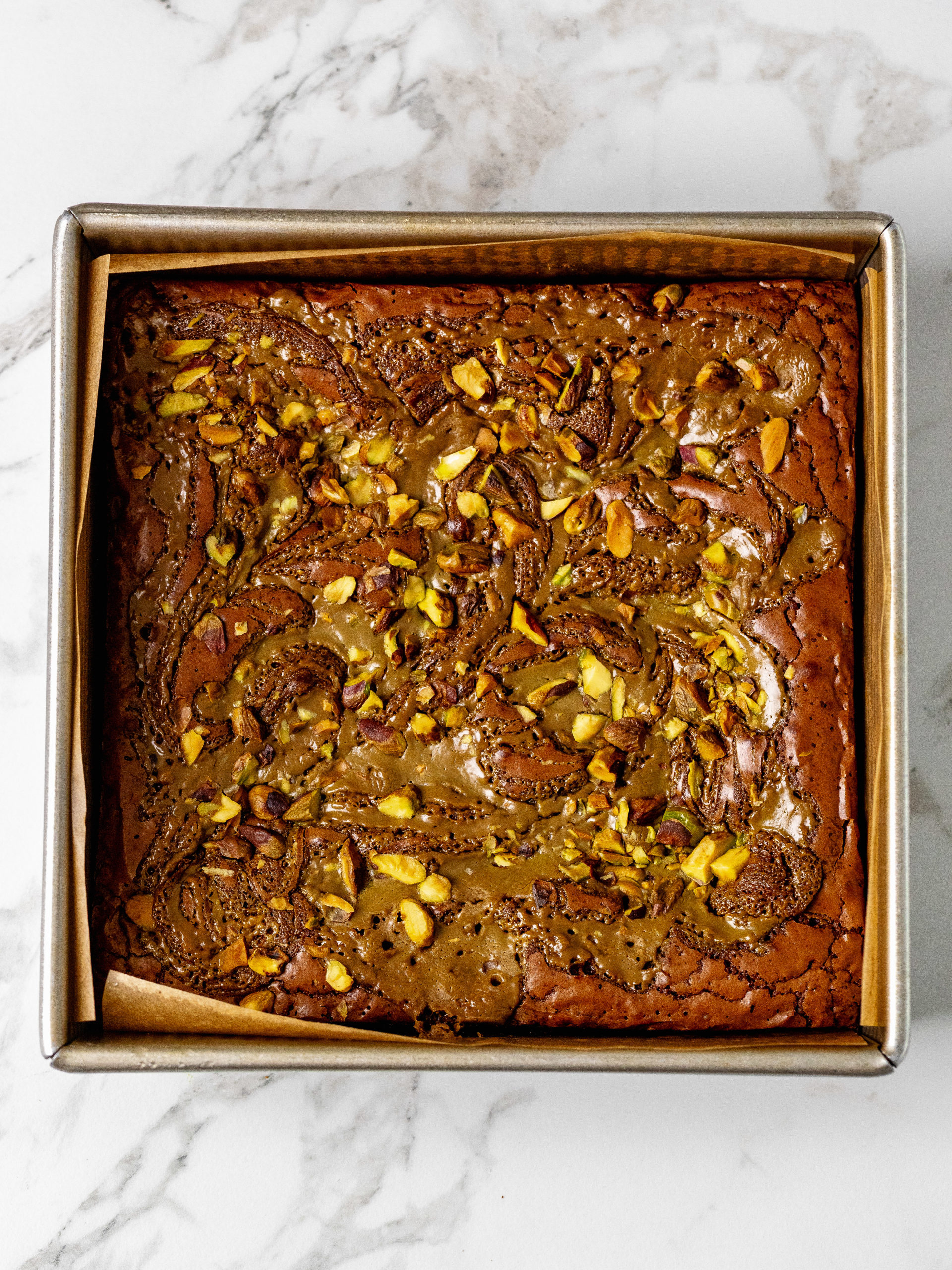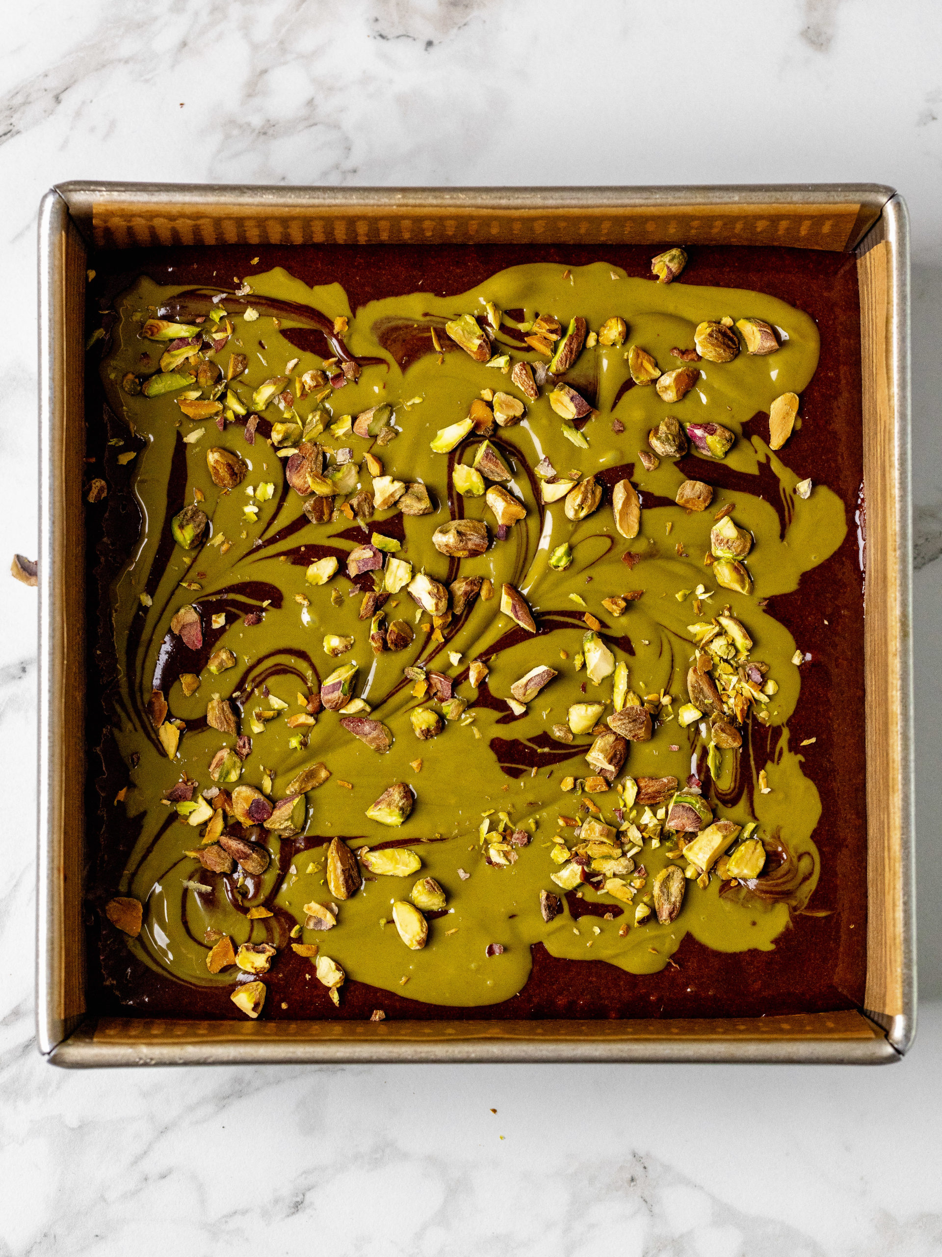 • Dollop the pistachio cream on top of the brownie and swirl it in. Then chop the pistachios and sprinkle them on top.