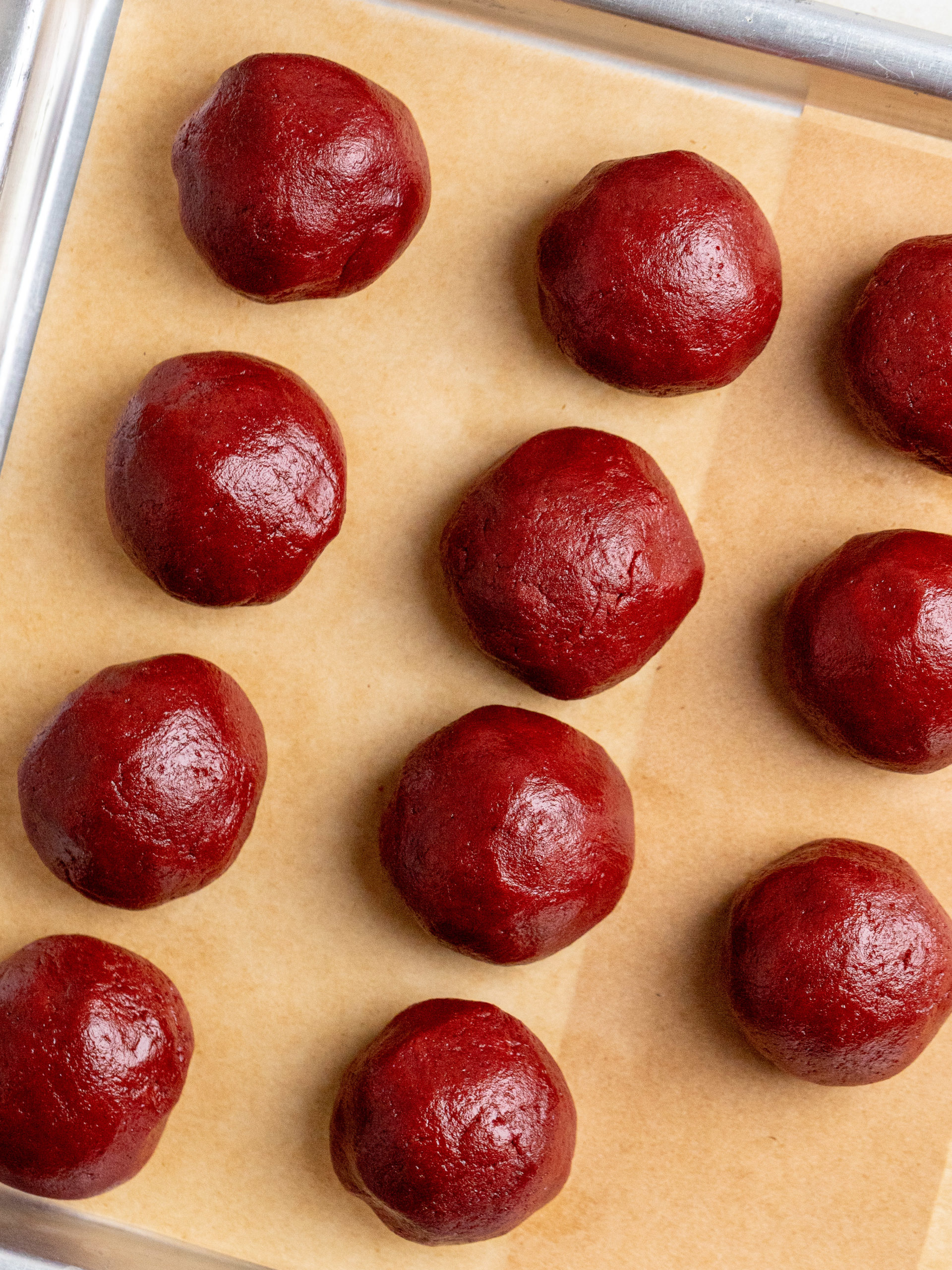 - Using a 2 tbsp/ 1.3 ounce (56 g pr cookie) cookie scoop, scoop out 11 cookies and place them on a tray lined with baking paper. Then roll them between your hands into a ball. Place the prepared cookies in the fridge to set for 1 hour.