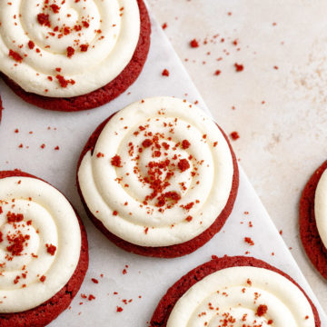 These are the most amazing Red Velvet Cookies with Cream Cheese Frosting! These delicious thick red velvet cookies, have crispy edges and a soft center and they are topped with a smooth and delicious cream cheese frosting, making them so festive and perfect to serve for Valentine’s Day or during the holidays.