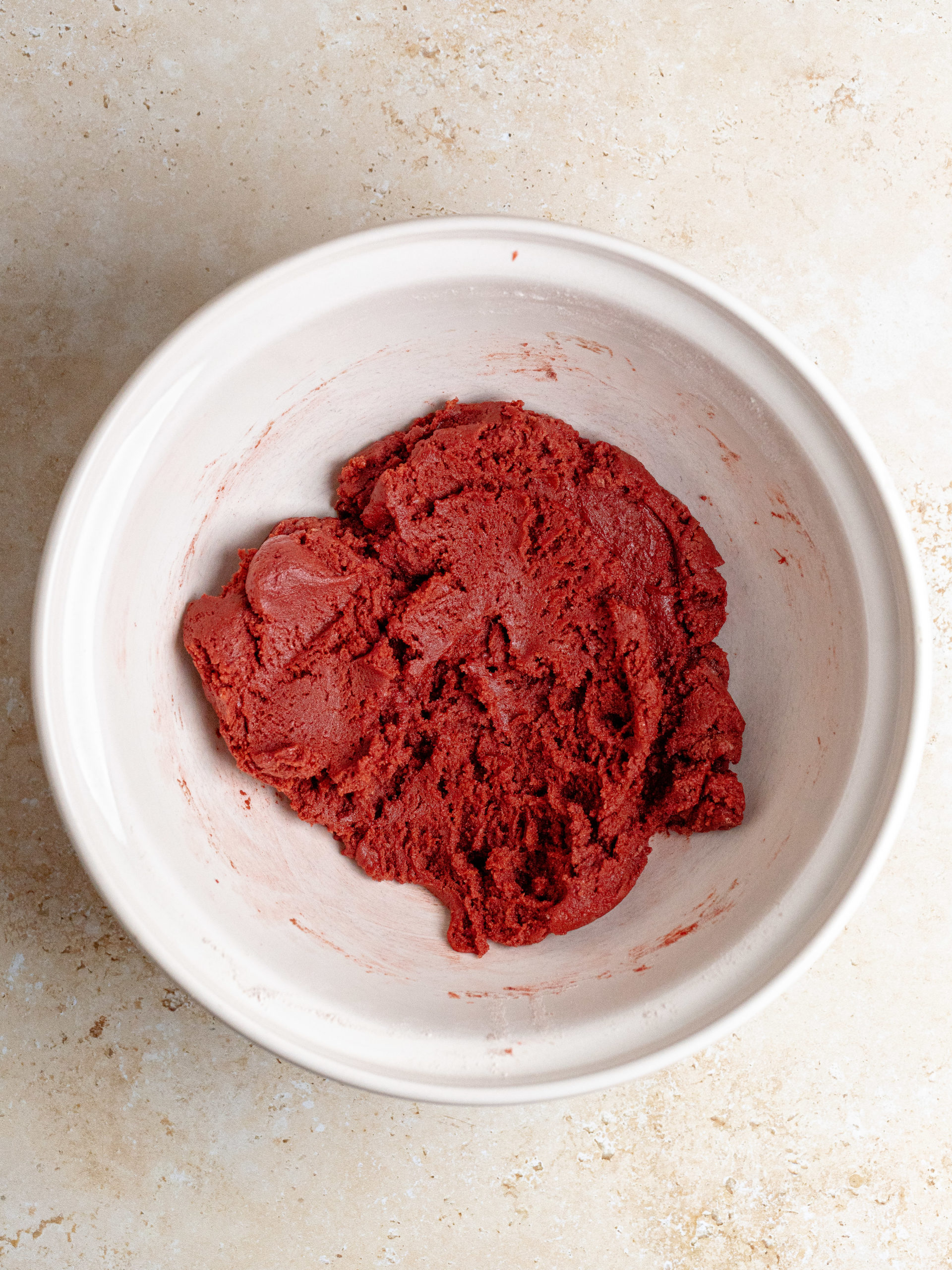 - Once the butter has reached room temperature add the granulated sugar, brown sugar and red gel food coloring and with a whisk, whisk it together for 1 minute. Alternatively, mix it together in a stand mixer using the paddle attachment.100 g granulated sugar, 100 g brown sugar, ½ teaspoon red gel food coloring or vegan food coloring