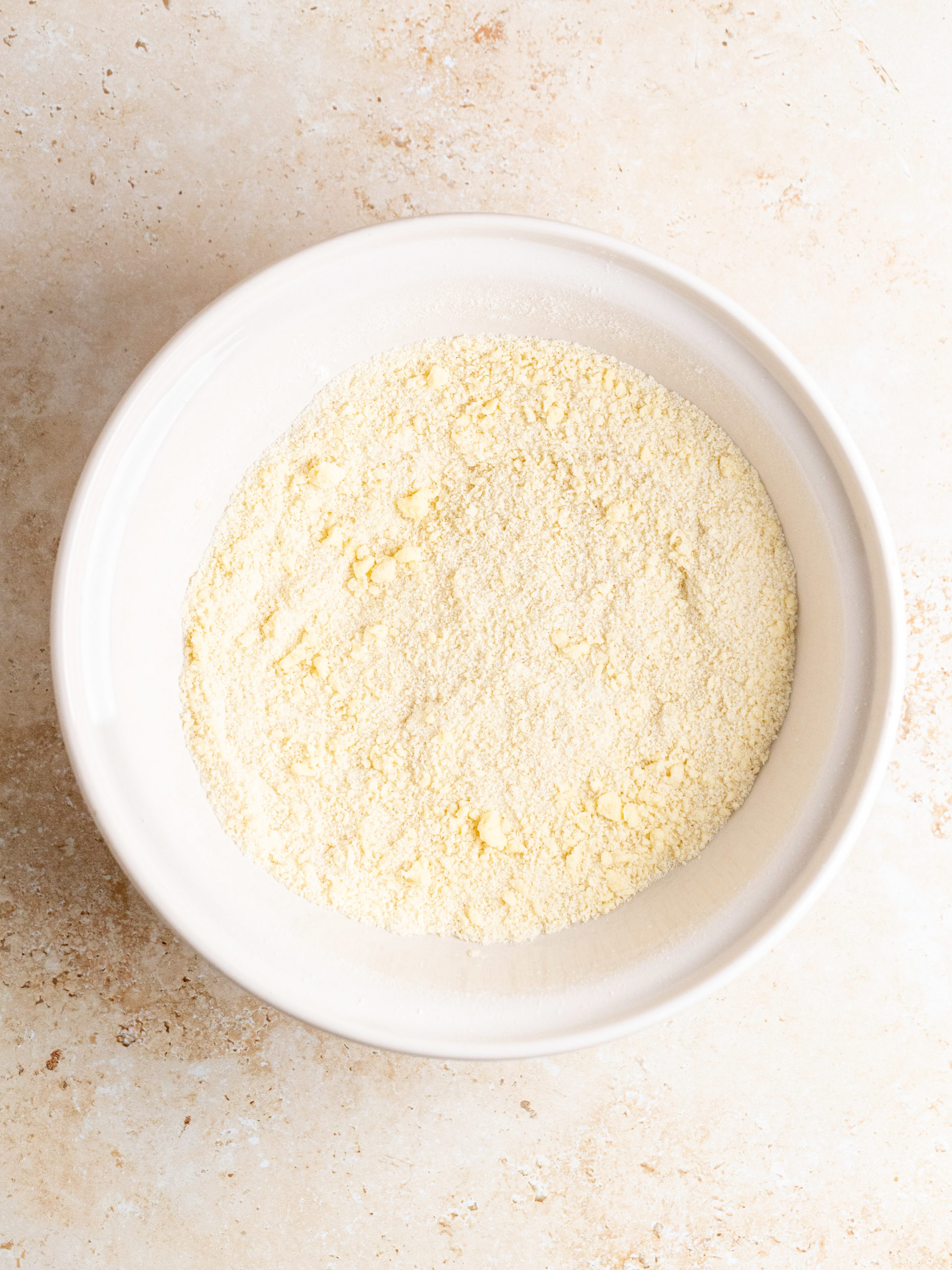 STEP 1: In a large bowl, add all of the dry ingredients and mix it together. Then add the butter and with a hand mixer or in a stand mixer, using the paddle attachment, mix it together until the butter has coated the dry ingredient and it looks sandy and crumbly.